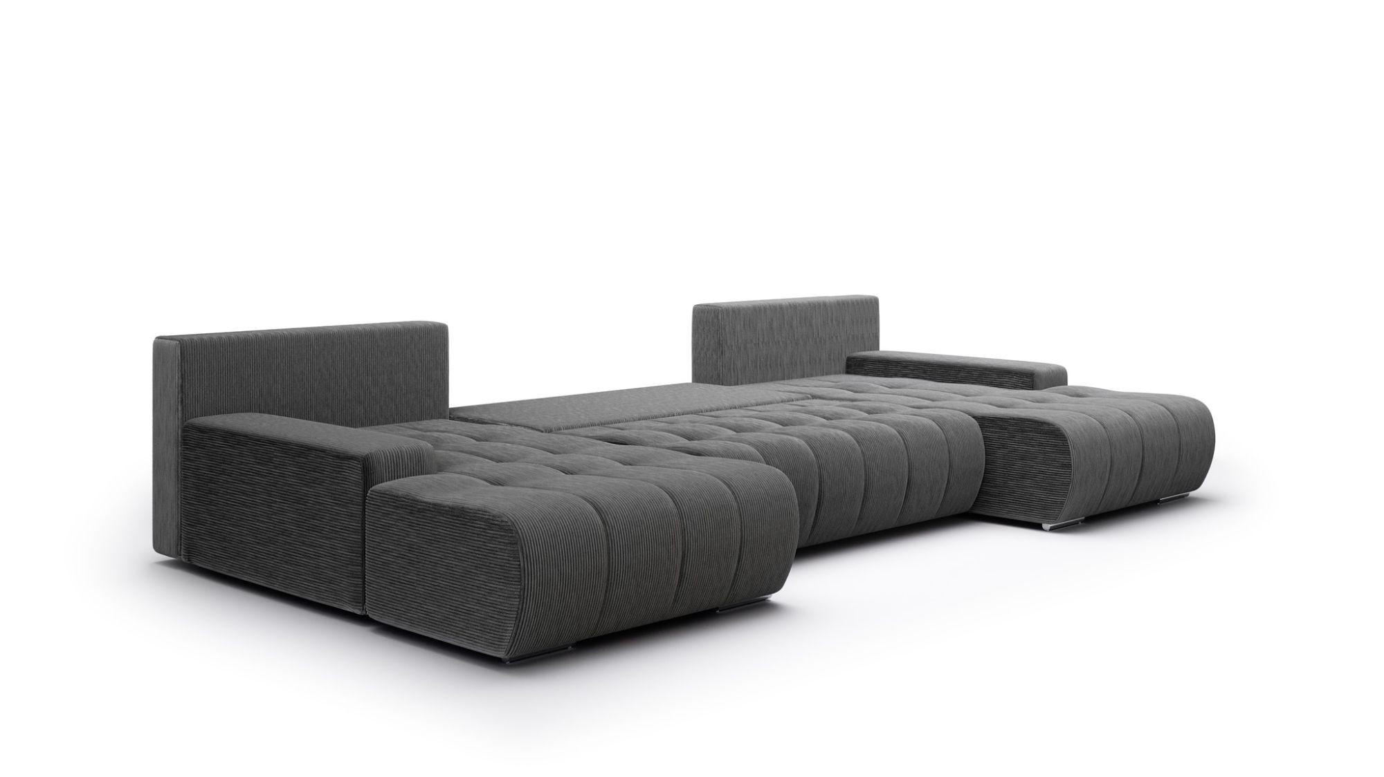 Wohnlandschaft VOGARmit Schlaffunktion Das modern gestaltete Schlaffunktionssofa Vogar gefällt durch ein zeitloses Design und einen hohen Komfort. Sofa lässt sich in wenigen Sekunden in eine Schlafmöglichkeit verwandeln. Die Vorteile dieses Sofas auf einen Blick: stabiles Holzgrundgestell Sitzfläche: Wellenfeder und PU-Schaum mit Schlaffunktion Bezug: Stoff 'Poso' Farbe: Dunkelgrau inkl. 4 x Rückenkissen inkl. 2 x Zierkissen Bettkasten: Ja Maße (alle Angaben sind ca. Maße): (B/H/T): ca. 350 x 70/85 x 185 cm Ottomane (B/T): ca. 104 x 185 cm Sitz-/Liegehöhe ca. 40 cm Gesamthöhe inkl. Rückenkissen: ca. 85 cm Schlaffläche: ca. 290 x 140 cm U-Form Stoff Poso: Poso ist ein Cord-Möbelstoff mit dicken Streifen, der auf Möbeln, Kissen, Dekorationselementen und Sofas wunderschön aussieht. Poso-Polstercord ist robust, langlebig, verschleißfest und garantiert Qualität für viele Jahre. Das Material passt perfekt zu klassischen, Retro und modernen Stilen. Die angenehme, sich warm anfühlende Struktur des Kordstoffs verleiht dem Interieur eine warme und gemütliche Atmosphäre, die zu Ruhe und Entspannung einlädt. Der Stoff verfügt über eine warme Farbpalette, welcher sich für jeden stilvollen Raum eignet.