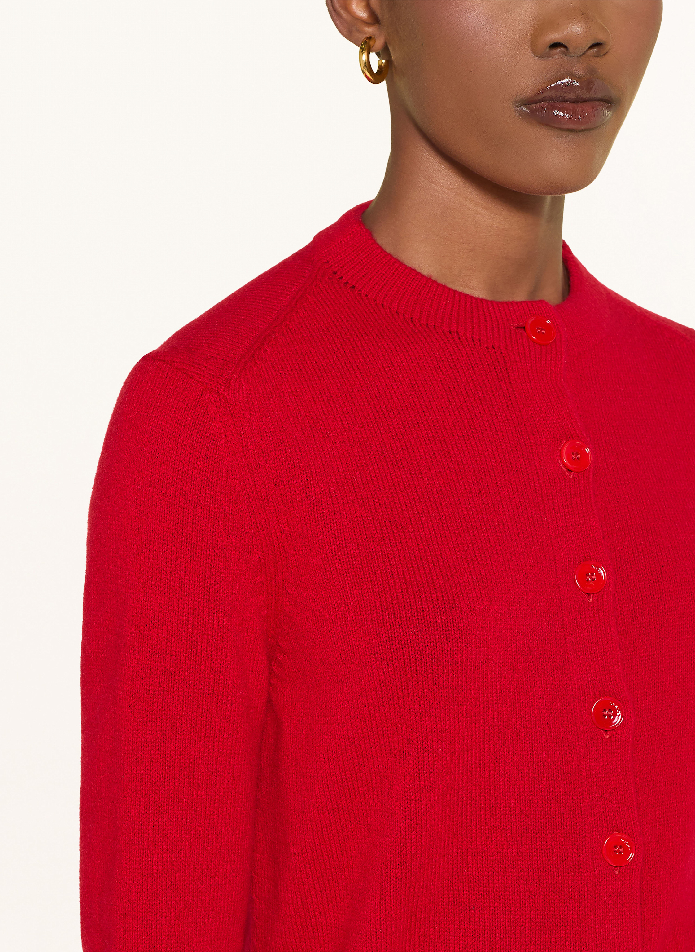 Glattstrick. Gerader Schnitt. Gerippter Rundhalsausschnitt. Schließt mit Knöpfen. Rippbündchen an Ärmeln und Saum. Gerippter Rüchenbesatz an den Ärmelenden. Reine Wollqualität
