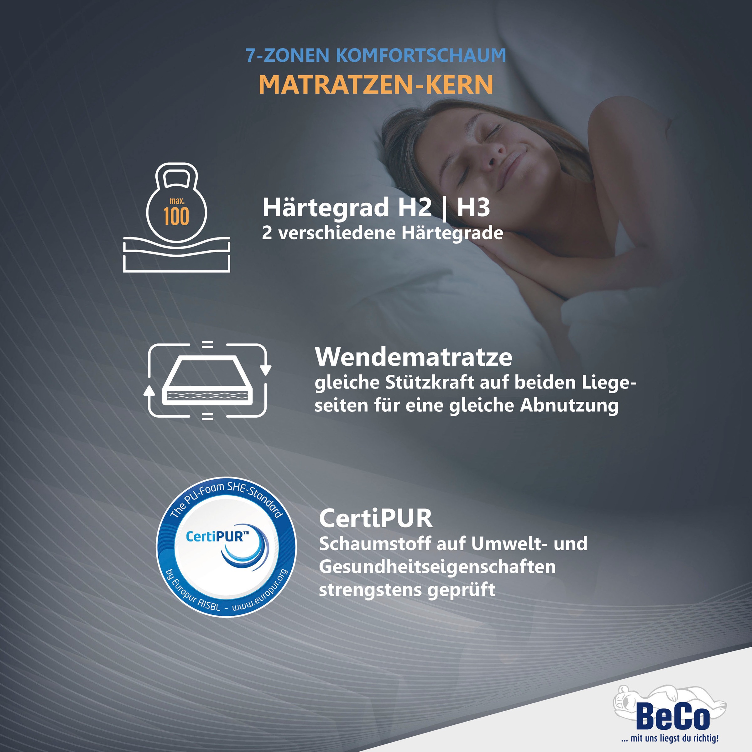 Das Klimawunder mit Mikrofaser-Feinbatist-Bezug, komfortabel und strapazierfähig. Alle Härtegrade H2 und H3 = 1 Preis. Die ca. 18 cm hohe Komfortschaum-Matratze BeCo „Dream Flex“ mit 7 Liegezonen für die unterschiedlichen Körperpartien ist äußerst punktelastisch, formstabil und atmungsaktiv. Der besonders sensible Schulterbereich kann weich einsinken, wodurch Verspannungen verhindert werden. Die Profilierung des Matratzenkerns und die verwendeten Materialien sorgen in den übrigen Zonen für die erforderliche Unterstützung. Durch den speziellen Kernaufbau eignet sich diese Matratze für alle Seiten-, Rücken- und Bauchschläfer. Die Matratze hat auf beiden Liegeseiten die gleiche Stützkraft und kann somit jederzeit gewendet werden. Der feine, hygienische und atmungsaktive Mikrofaser-Feinbatist-Bezug ist mit einer Klimafaser versteppt. Er ist sehr anschmiegsam und strapazierfähig. Der Bezug hat einen 4-seitigen Reißverschluss und ist teilbar, abnehmbar und bis 60 °C waschbar. Ideal für Hausstauballergiker geeignet. Die offenporigen Materialien sorgen für ein gutes Schlafklima ohne Feuchtigkeitsstau. Hergestellt in Deutschland., Top-Feature: Top-Features: Mit Schulter-, Becken- und Lordose-Komfortzone - Bei der Schulterkomfortzone handelt es sich um eine spezielle Zone zur Lagerung der Schulter. Die Schulterkomfortzone ist besonders nachgiebig und erlaubt ein tieferes Einsinken der Schulterpartie in seitlicher Schlaflage. Die verstärkte Beckenkomfortzone hingegen bietet die nötige Unterstützung für eine gesunde Lagerung der Wirbelsäule. Durch den festerem Schaum im Lordosebereich, wird der Rücken hier optimal abgestützt und die natürliche Wirbelsäulenform., Details: Schlafposition: Bauchschläfer, Rückenschläfer, Seitenschläfer, Anzahl Liegezonen: 7, Härtegrad: 3, Körpergewicht von: 81 kg, Körpergewicht bis: 100 kg, Anzahl Matratzenkerne: 1, Ausstattung & Funktionen: Allergikerinformation: Hausstauballergiker geeignet, Klimaregulierung: Ventilation, Eigenschaften Matratze: Partnermatratze, für verstellbare Lattenroste geeignet, Eigenschaften Matratzenbezug: abnehmbar, mit Reißverschluss, teilbar, Maße & Gewicht: Breite: 180 cm, Länge: 200 cm, Höhe: 18 cm, Gewicht: 17 kg, Bezug: Art Bezug: Polyester Bezug, Materialzusammensetzung: Bezug: 100% Polyester. Steppfüllung: 100% Polyester, Pflegehinweise: 60°C Maschinenwäsche, trocknergeeignet, Kernaufbau: Kernaufbau: Komfortschaum (7-Zonenwelle, ca. 16,5 cm hoch, 28 kg/m³), Wissenswertes: OEKO-TEX® Standard 100 Zertifikatsnummer: Sammelzertifikat 09.0.67812, Lieferumfang: Anzahl Teile: 1 Stk., Lieferung: gefaltet und gerollt, Auslieferung: Dieser Artikel wird zum Schutz der Umwelt bewusst volumenreduziert verpackt und zur einfachen Handhabung gefaltet und gerollt ausgeliefert. Die Matratze benötigt ca. 24 Stunden,um sich vollkommen zu entfalten. Leider ist die Rücknahme Ihrer Altmatratze bei diesem Artikel nicht möglich., Bestellhinweise: Schaumfarbehinweis: Die Farben der Matratzenkerne können von der Abbildung abweichen, weil diese in unterschiedlichen Farben produziert werden können., Lattenrosthinweis: Wir raten Ihnen, bei einem Matratzenwechsel auch ein neues Lattenrost zu verwenden Bitte beachten Sie, dass Sie für das Bettenmaß 160/200 cm = 2x 80/200-cm-Lattenroste, für das Maß 180/200 cm = 2x 90/200-cm-Lattenroste und für das Maß 200/200 cm = 2x 100/200-cm-Lattenroste benötigen Bei den Größen 80/190 cm und 90/190 cm handelt es sich um Sondergrößen, bitte überprüfen Sie noch einmal die Maße Ihres Bettes Empfehlenswert ist ein Lattenrost mit mindestens 28 Leisten (bei 200 cm Länge) Bevor Sie Ihre Bestellung aufgeben, sollten Sie unbedingt die Innenmaße des Bettgestells ausmessen