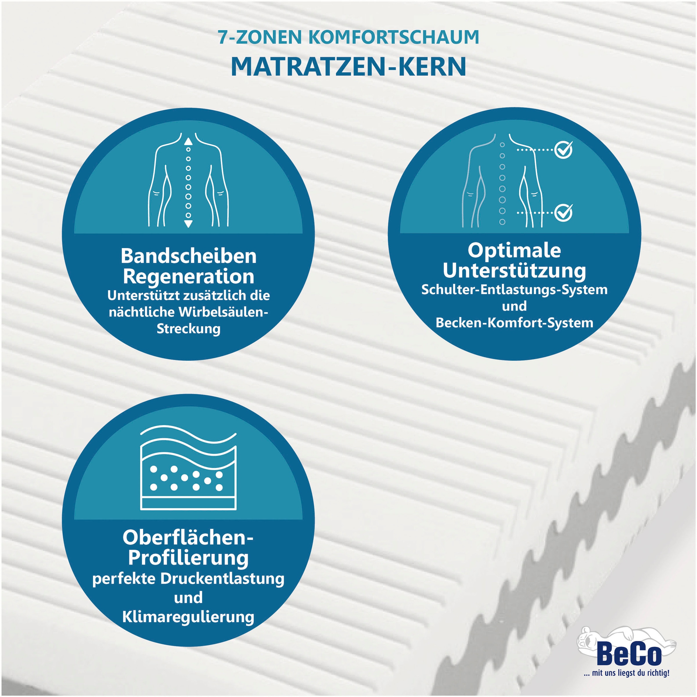 Luxus & Sicherheit für Jedermann, auch bei hohen Belastungen und Körpergewichten. Ca. 30 cm hohe Premium-Schaummatratze mit punktelastischem Komfortschaum-Kern (Kernhöhe ca. 27 cm). Durch die Gesamtbauhöhe von ca. 30 cm bietet diese Matratze First Class Liegekomfort und Schlafkomfort für Jedermann. Langlebig und sicher! Je höher der Kern, desto mehr Material zur Stützung und desto besser die Wirkungsweise der 7 Liegezonen. »Trio«-Technologie für eine perfekte Körperanpassung in jeder Liegeposition und für alle Gewichtsklassen: feste und dauerhaft langlebige Körper-Stützschicht und beidseitig druckentlastende Anpassungsschicht. 7 ergonomische Liegezonen mit hochelastischem Schulter-Absenkungs-System und Becken-Komfort-System zur korrekten Lagerung der Wirbelsäule in allen Liegepositionen. Hervorragende Druckentlastung durch den anschmiegsamen Schaum und gute Klimaregulierung durch die spezielle Oberflächenprofilierung. Beide Liegeseiten mit gleicher Stützkraft, dadurch kann die Matratze gedreht und gewendet werden. Der hochelastische, hautfreundliche und feuchtigkeitsregulierende Doppeltuch-Bezug ist mit bauschiger Klimafaser in 7-Zonen-Funktion versteppt. Abnehmbar durch Rundumreißverschluss, teilbar und in der Haushaltswaschmaschine waschbar. Mit Trikot-Unterbezug für ein leichteres Aufziehen des Bezuges nach dem Waschvorgang., Top-Feature: Top-Features: Für Gewichtige - Geeignet für Menschen über 100 kg Körpergewicht durch den Einsatz von Materialien mit hohen Raumgewichten oder besonders stabiler Federkerne., Extrahoch für komfortables Ein- und Aussteigen - Je höher die Matratze, desto einfacher und bequemer ist das Ein- und Aussteigen. So können auch niedrige Bettrahmen durch einen einfachen Matratzentausch mit mehr Komfort ausgestattet werden., Details: Schlafposition: Bauchschläfer, Rückenschläfer, Seitenschläfer, Anzahl Liegezonen: 7, Härtegrad: 2, Körpergewicht von: 0 kg, Körpergewicht bis: 80 kg, Farbbezeichnung: weiß, Ausstattung & Funktionen: Anzahl Griffschlaufen: 4 Stk., Allergikerinformation: Hausstauballergiker geeignet, Klimaregulierung: sehr gute Ventilation, Eigenschaften Matratze: als Wendematratze nutzbar, für verstellbare Lattenroste geeignet, Eigenschaften Matratzenbezug: abnehmbar, mit Reißverschluss, teilbar, Maße & Gewicht: Breite: 140 cm, Länge: 200 cm, Höhe: 30 cm, Bezug: Art Bezug: Polyester Bezug, Materialzusammensetzung: Bezug: 60% Polyester, 38% Viskose, 2% Elasthan, Pflegehinweise: 60°C Maschinenwäsche, Kernaufbau: Kernaufbau: Komfortschaum (vertikale Einschnitte, 27 cm hoch, 35 kg/m³), Wissenswertes: OEKO-TEX® Standard 100 Zertifikatsnummer: Sammelzertifikat 09.0.67812, Lieferumfang: Anzahl Teile: 1 Stk., Lieferung: gerollt, Auslieferung: gerollt, Bestellhinweise: Schaumfarbehinweis: Die Farben der Matratzenkerne können von der Abbildung abweichen, weil diese in unterschiedlichen Farben produziert werden können.