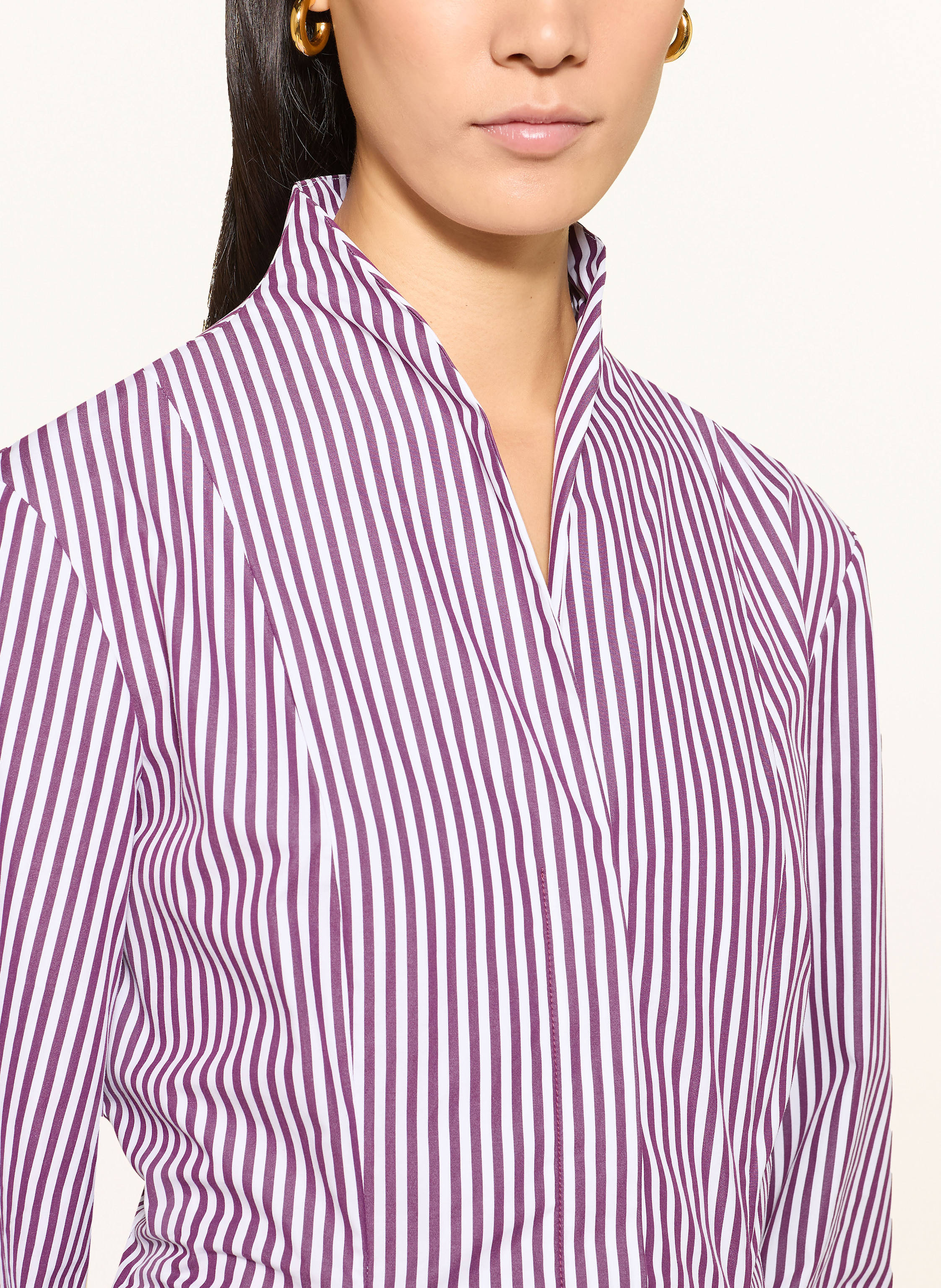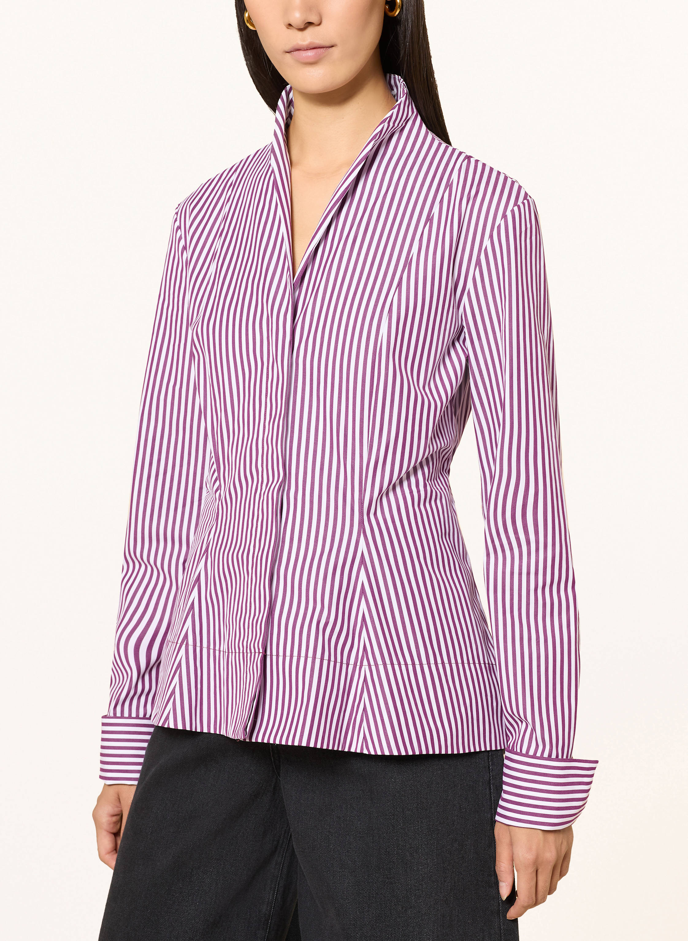Gerader Schnitt. Kelchkragen. Schließt mit durchgehender, verdeckter Knopfleiste. Zweiknopf-Manschette. Schlitz an den Ärmelenden. Streifenmuster allover. Fester Griff. Weiche Haptik. Reine Baumwolle