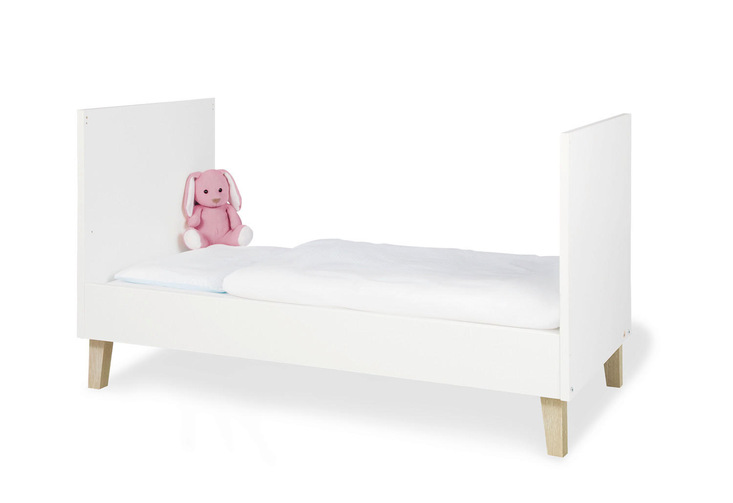 Die freundliche Ausstrahlung eines Interieurs im skandinavisch inspirierten Look zaubert dieses umbaubare Gitterbett in Weiß und Eichefarben zusammen mit weiteren Möbeln derselben Serie ins Kinderzimmer. Dabei setzen die Füße aus Eiche massiv mit authentischer Echtholzstruktur rustikale Akzente. Neben der Optik kann sich aber auch die Funktionalität sehen lassen. So ist der Lattenrost 3-fach höhenverstellbar, um Mama beziehungsweise Papa das Hineinlegen und Herausheben des Nesthäkchens rückenschonend zu erleichtern. Preis versteht sich ohne Matratze, Bettwaren und Dekoration. Durch die Entfernung von 3 Schlupfsprossen hat der Nachwuchs später die Möglichkeit, das Bettchen eigenständig verlassen. Praktisch: Mithilfe der 2 Umbauseiten wird aus dem mitwachsenden Babybett zu gegebener Zeit ein Juniorbett oder Sitzsofa. Sie wollen Ihrem Kind ein schönes und gleichzeitig zweckdienlich eingerichtetes Zuhause bieten? Dann greifen Sie stilsicher zu diesem umbaubaren Gitterbett in Weiß und Eichefarben!