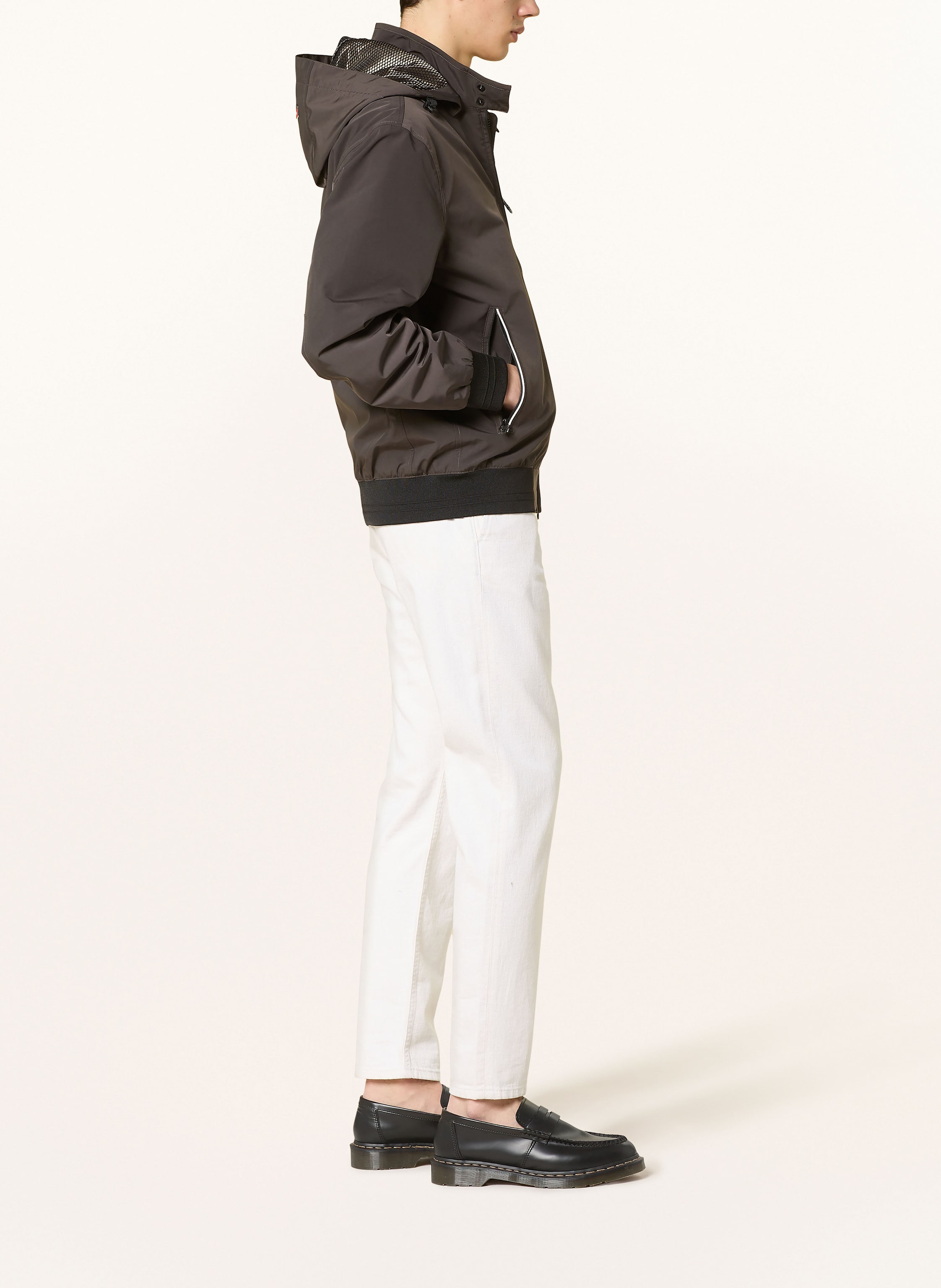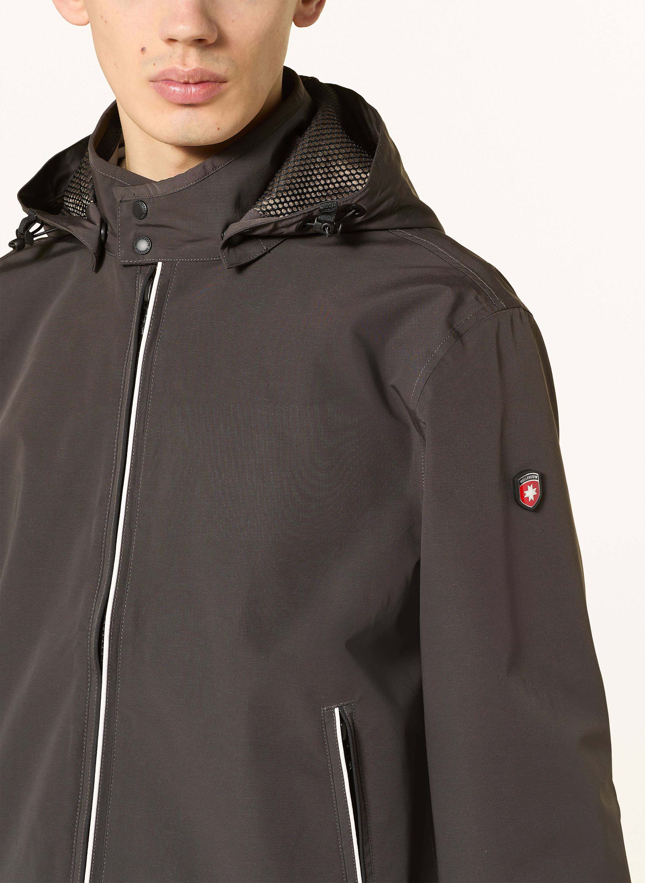 Gerader Schnitt. Atmungsaktiv, wasser- und winddicht. Stehkragen mit Druckknopfriegel. Größenverstellbare, abnehmbare Kapuze mit Mesh-Futter und Klettverschlussriegel. Schließt mit Zwei-Wege-Reißverschluss. Seitliche Reißverschlusstaschen. Innentasche. Elastische Rippbündchen an den Ärmelenden und am Saum. Gefütterte Verarbeitung. Glattes Innenfutter. Kontrastierende Paspelierungen. Label-Plakette am Arm und an der Kapuze