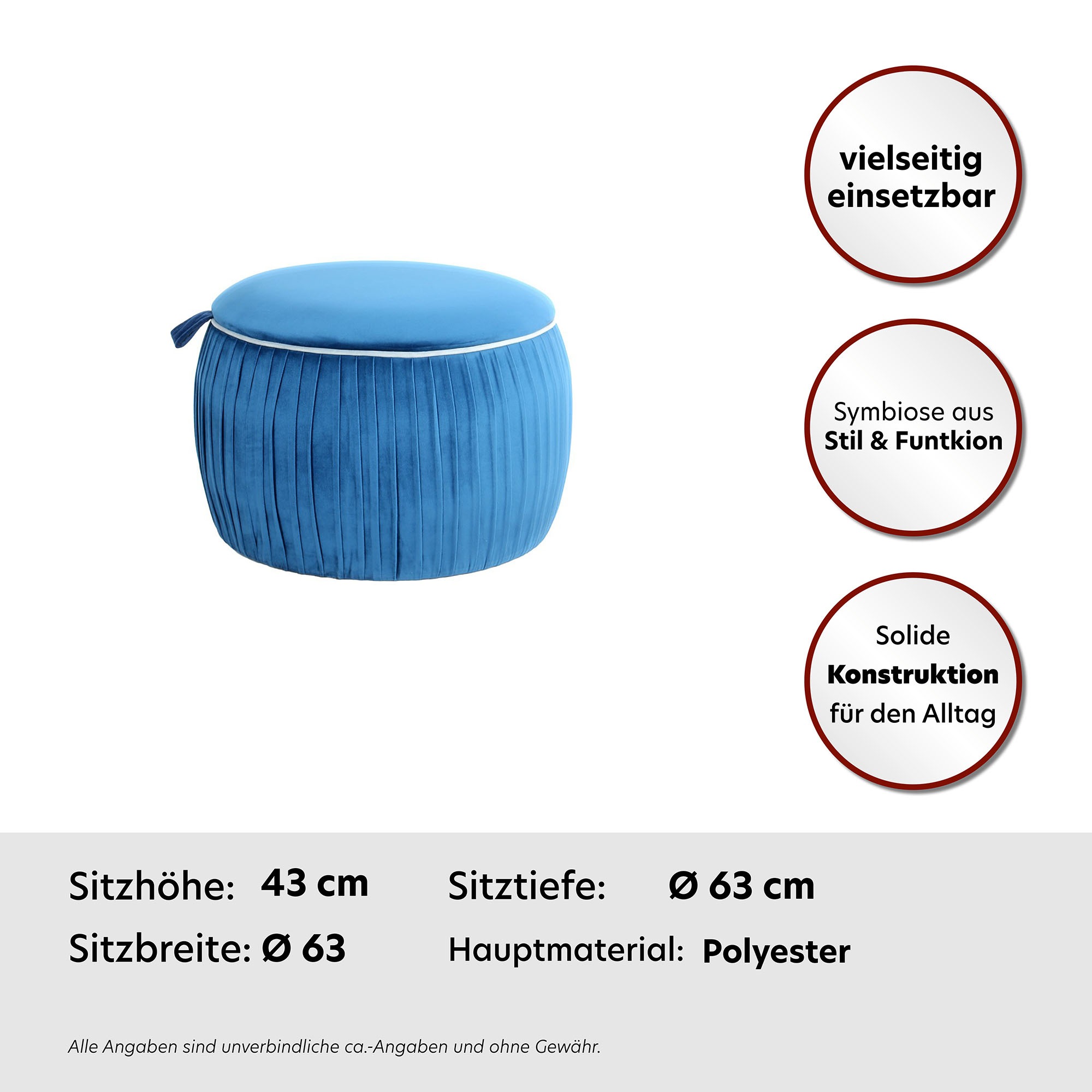 stilvoll, mit Stauraum, rund, Maße & Gewicht: Gewicht: 13,5, Breite: 63, Höhe: 43, Tiefe: 63, Hinweise: Hinweis Maßangaben: Alle Angaben sind ca.-Maße., Pflegehinweise: Bitte beachten Sie die Pflegehinweise gemäß dem beiliegenden Produkt- und Materialpass., Material: Information Materialzusammensetzung: Samtbezug / Schaumstoffpolsterung / Kieferholz, MDF-Platte, Farbe: Farbhinweise: Bitte beachten Sie, dass bei Online-Bildern der Artikel die Farben auf dem heimischen Monitor von den Originalfarbtönen abweichen können., Produktdetails: Farbbezeichnung: Blau, Lieferzustand: montiert