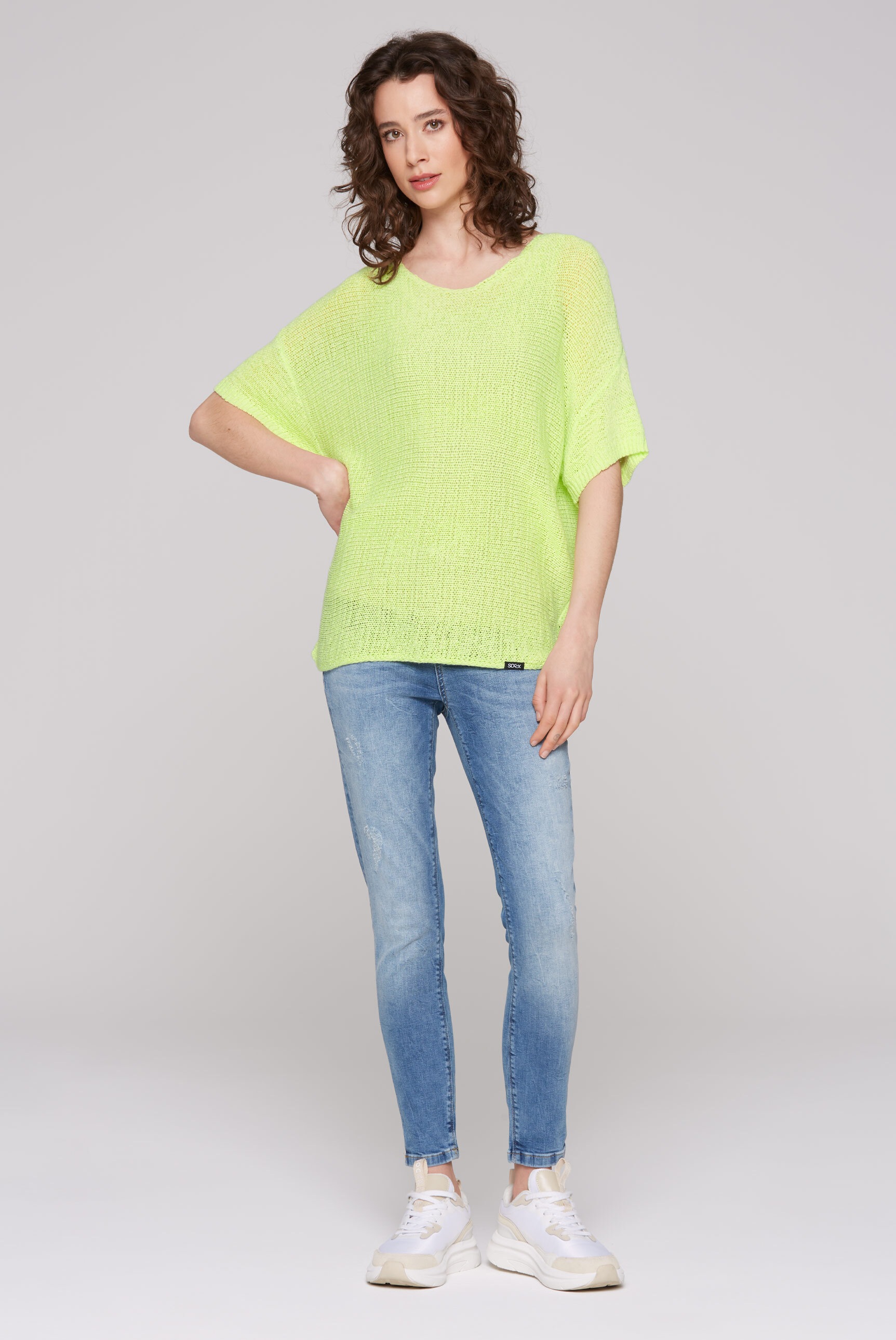Die Sommer-Version des Pullovers von SOCCX präsentiert sich mit einem kurzen Ärmel und einer tollen Struktur durch das besondere Garn. Zudem verläuft das Strickmuster waagerecht. Der Kurzarmpullover ist mit einem femininen Rundhalsausschnitt gestaltet und passt super zu Shorts, Röcken und Hosen. Das Model ist 176 cm groß und trägt Gr. S., Material: Materialzusammensetzung: Material: 55% Polyacryl, 45% Polyamid, Materialeigenschaften: atmungsaktiv, Pflegehinweise: Schonwäsche, Optik/Stil: Optik: Strukturmuster, Farbe: Farbbezeichnung: gelb, Passform/Schnitt: Kragen: ohne Kragen, Ausschnitt: Rundhals, Ärmellänge: Kurzarm, Ärmeldetails: eingesetzt, Ärmelabschluss: Rippbündchen, Passform: regular fit, Schnittform Länge: normal, Details: Taschen: Ohne Taschen, Besondere Merkmale: in schönen waagerechtem Strickmuster