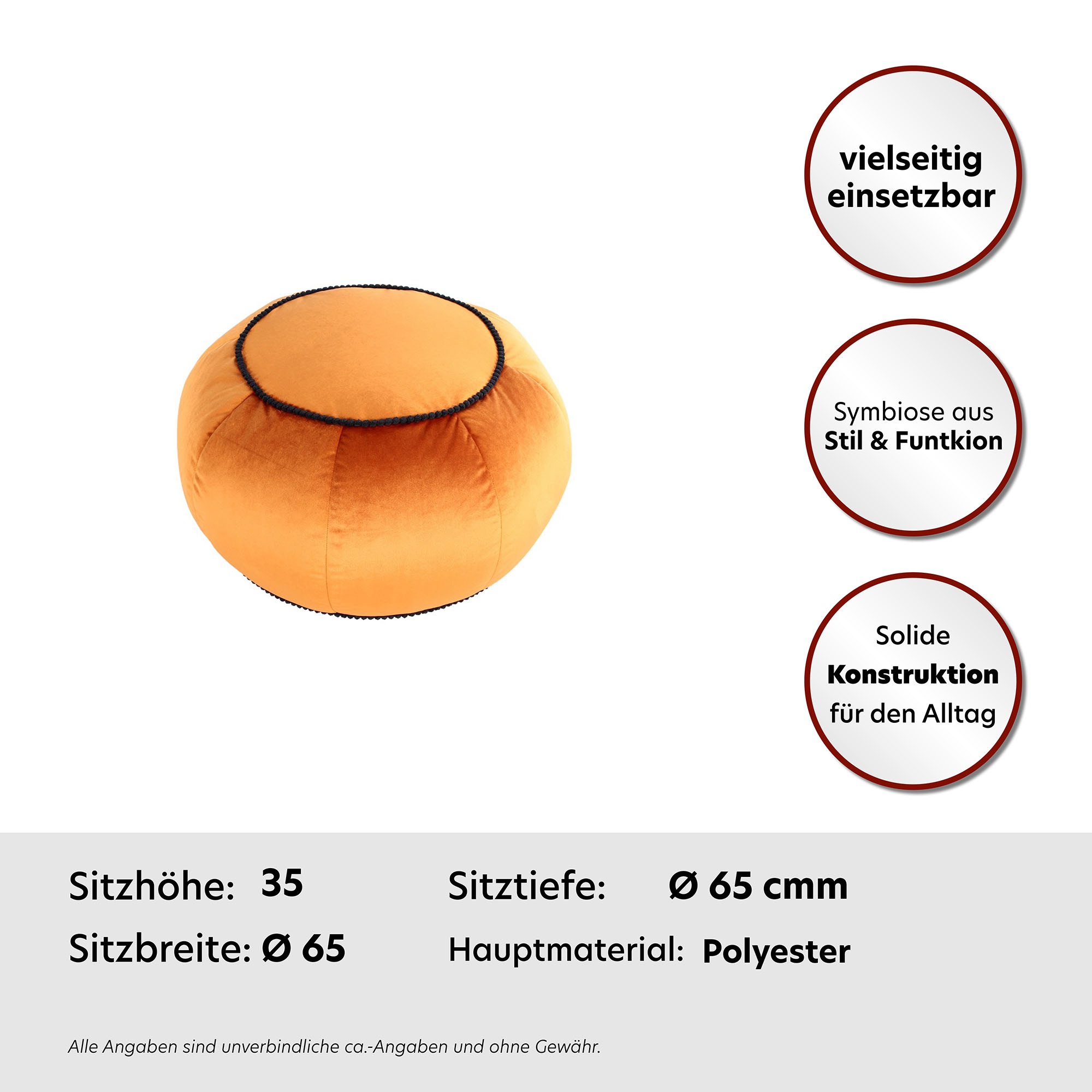 Produktdetails: Markeninformationen: Kayoom, Ausstattung & Funktionen: Ausführung Sitzfläche: gepolstert, Maßangaben: Belastbarkeit maximal: 100 kg, Gewicht: 2,5 kg, Sitzhöhe: 35 cm, Durchmesser Sitzfläche: 65 cm, Hinweis Maßangaben: Alle Angaben sind ca.-Maße., Breite: 65 cm, Höhe: 35 cm, Tiefe: 65 cm, Material: Bezug Korpus: Polyester, Bezug Sitzfläche: Polyester, Material Korpus: Polyester, Information Materialzusammensetzung: Bezug: 100% Polyester (Samt) / Füllmaterial: 100% Polystryol, Material Sitzfläche: Polyester, Farbe: Farbe Korpus: bronze, Farbhinweise: Bitte beachten Sie, dass bei Online-Bildern der Artikel die Farben auf dem heimischen Monitor von den Originalfarbtönen abweichen können., Farbbezeichnung: Bronze, Optik/Stil: Optik: Samtoptik, Lieferung & Montage: Anzahl Packstücke: 1 Stk., Hinweise: Pflegehinweise: Bitte beachten Sie die Pflegehinweise gemäß dem beiliegenden Produkt- und Materialpass., Pflegehinweise Bezug: abwischbar, Wissenswertes: Wissenswertes: Der Pouf kann in seiner tatsächlichen Farbgebung von den Bildern abweichen.
