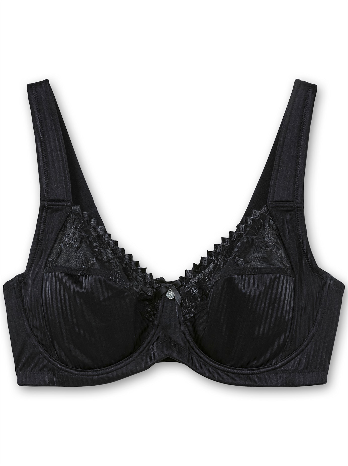 • Florale Spitze und tonale Streifen • Weich gepolsterte Träger • Formbügel und Seitenstützen • Minimizer-Form lässt Brust kleiner wirken • Pflegeleichtes, elastisches Material Minimizer-BH mit Bügeln. Die zarte florale Spitze an den Obercups ist leicht transparent, die dezenten Streifen und die gezackten Ränder sind weitere raffinierte Details. Für optimalen Tragekomfort sorgen die eingearbeiteten Seitenstützen, die breiten, weich gepolsterten Träger und der dreifach verstellbare Rückenverschluss. Mehr zur Passform Dank der geschickten Schnittführung lässt der BH die Brust optisch kleiner wirken. Seitenstützen und Bügel geben optimalen Halt. Mehr zum Material Die elastische Qualität liegt angenehm auf der Haut und ist pflegeleicht. 82% Polyamid, 18% Elasthan., Farbe: Farbbezeichnung: schwarz, Material: Materialzusammensetzung: 82% Polyamid, 18% Elasthan, Pflegehinweise: 30°C Maschinenwäsche, 30°C Schonwäsche, Maschinenwäsche, Körbchen / Cup: Bügel: mit Bügel, BH-Träger: Träger: breite Träger