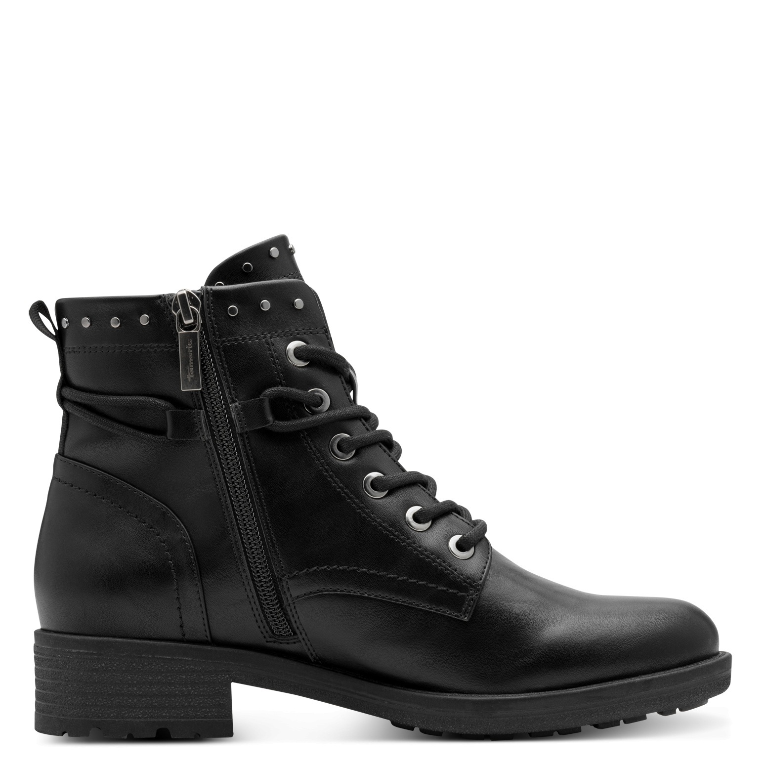 Schnürstiefelette, Tamaris, aus Lederimitat, Maßangaben: Absatzhöhe: 3,5 cm, Farbe: Farbbezeichnung: schwarz, Optik: unifarben, Material: Obermaterial: Lederimitat, Innenmaterial: Synthetik, Textil, Innenmaterialeigenschaften: wärmend, Optik/Stil: Applikationen: Logoprägung, Nieten, Ziernähte, Details: Besondere Merkmale: , Blockabsatz, Schnürboots mit Nieten am Schaftrand besetzt, Verschluss: Reißverschluss, Schnürung, Schuhspitze: rund, Sohle: Innensohlenmaterial: Textil, Innensohlenmaterialeigenschaften: wärmend, Laufsohlenmaterial: Synthetik, Laufsohlenprofil: profiliert, Passform/Schnitt: Schuhweite: Normal (Weite F)
