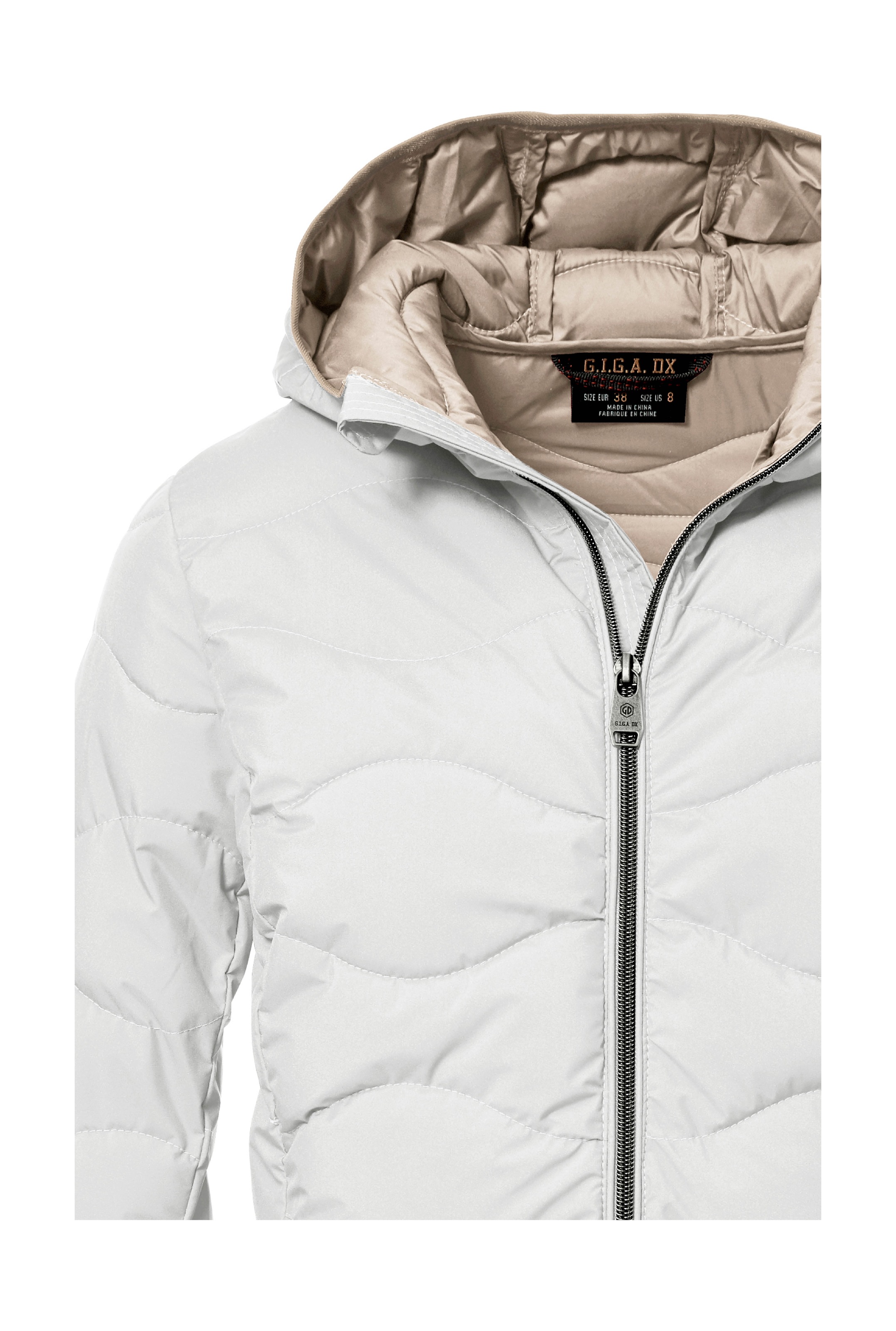 Die Damen Funktionsjacke von G.I.G.A. DX besticht durch ihre elegante Steppung und hochwertige Accessoires. Der atmungsaktive und wasserabweisende Oberstoff mit einer 8.000 mm Wassersäule sorgt für Wetterschutz und optimalen Tragekomfort. Der Saum und die Ärmelabschlüsse sind elastisch und daher besonders bequem. Die beiden Eingrifftaschen sind mit Zippern verschließbar, sodass nichts verloren geht. Der Kinnschutz am Frontreißverschluss verhindert das Einklemmen der Haut. Diese Jacke wurde aus recycelten Materialien hergestellt und mit fluorfreien Mitteln imprägniert., Material: Materialzusammensetzung: Oberstoff: 100% Polyester, Futter: 100% Polyester, Wattierung: 100% Polyester, Pflegehinweise: Schonwäsche, Farbe: Farbbezeichnung: naturweiß, Details: Besondere Merkmale: Elegante, wasserabweisende Damenjacke aus recycelten Materialien, Maßangaben: Größenhinweis: Fällt klein aus, bitte eine Größe größer bestellen.