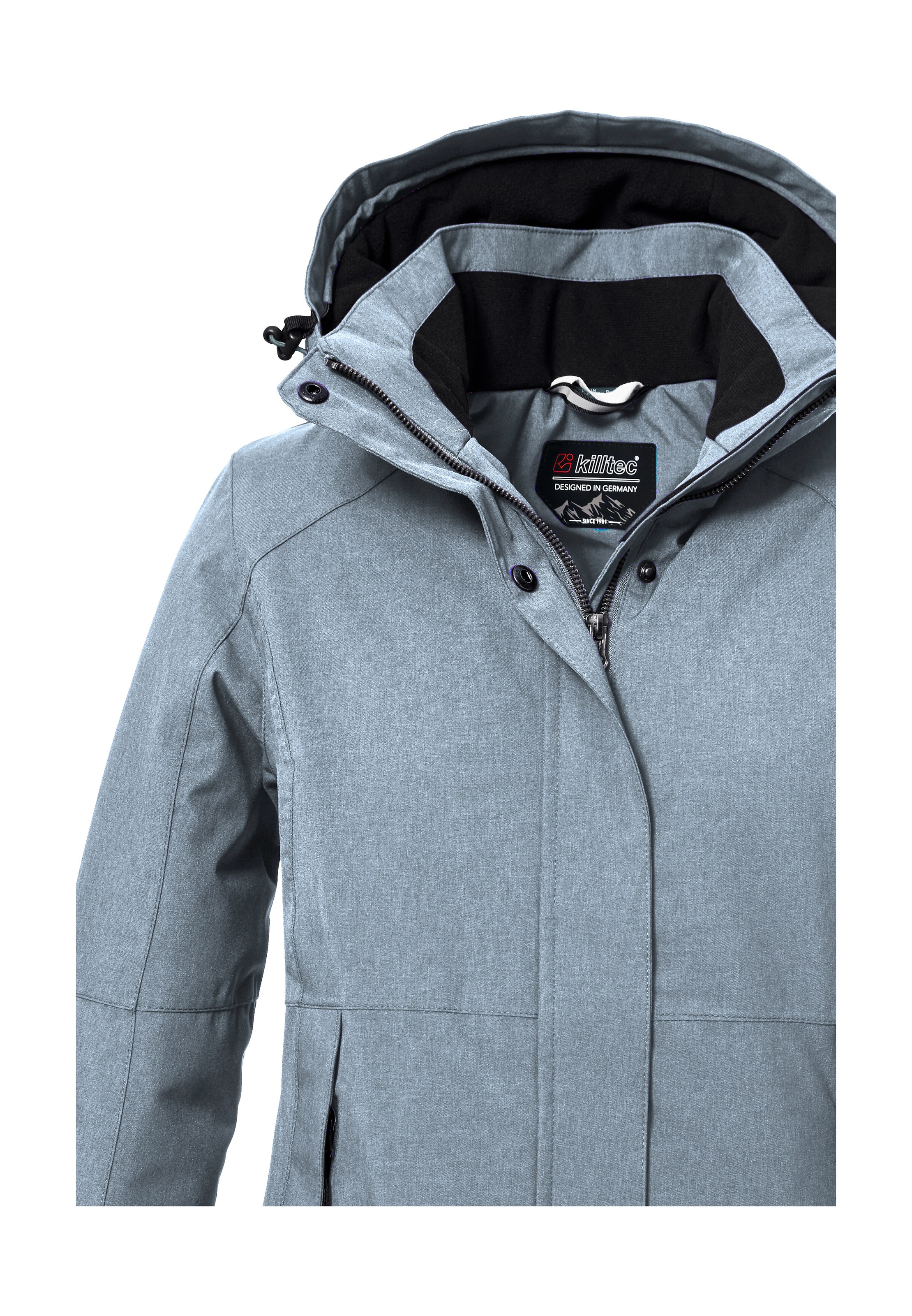 Die Damen Funktionsjacke von killtec besticht durch ihr zeitloses Design und funktionale Eigenschaften. Sie ist durch verschweißte Nähte und mit einer 10.000 mm Wassersäule wasser- und winddicht (Unser Tipp: Ab und zu sollte die Jacke neu imprägniert werden). Gleichzeitig ist die Jacke atmungsaktiv mit einer Wasserdampfdurchlässigkeit 3.000 g/m²/24 h. Die Kapuze mit Gummizug ist regulierbar und lässt sich bei Bedarf abzippen. Die Ärmelbündchen sind durch Klettverschlüsse verstellbar. Der Saum lässt sich anhand eines Kordelzuges regulieren. Die zwei Seitentaschen und eine Innentasche bieten genügend Stauraum. Der Kinnschutz am verdeckten Frontreißverschluss verhindert ein Einklemmen der Haut. Diese Jacke wurde mit fluorfreien Mitteln imprägniert., Material: Materialzusammensetzung: Oberstoff: 100% Polyester, Futter: 100% Polyester, Wattierung: 100% Polyester, Pflegehinweise: Schonwäsche, Farbe: Farbbezeichnung: grau, Details: Besondere Merkmale: Wasserdichte Damen Funktionsjacke mit abnehmbarer Kapuze