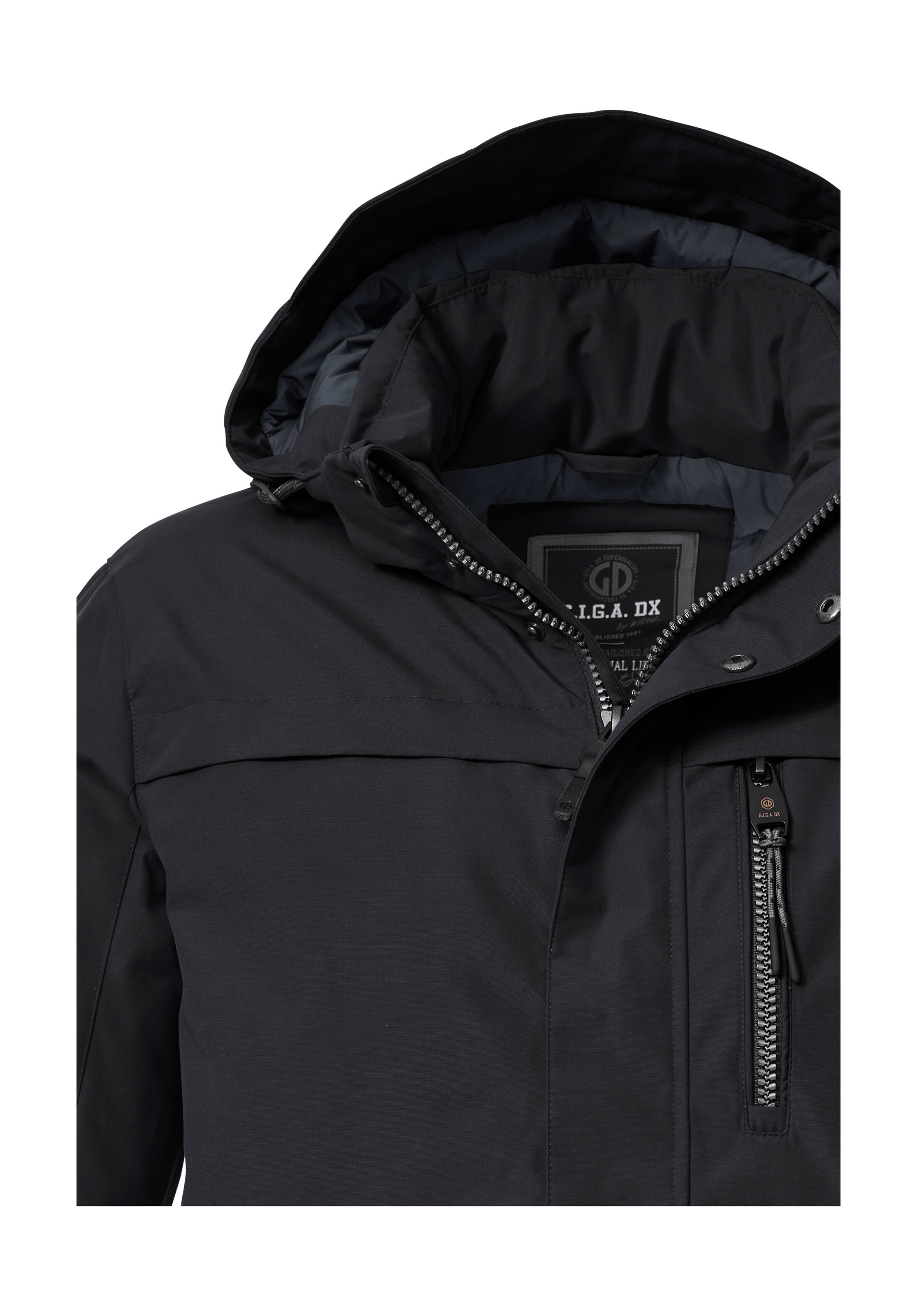 Die dick gefütterte G.I.G.A. DX Herren Winterjacke besticht durch ihre Citytauglichkeit und Funktionalität. Die Jacke hat verschweißte Nähte und ist mit einer 10.000 mm Wassersäule wasser- und winddicht und gleichzeitig atmungsaktiv. Die Weite des Saum und der Ärmelabschlüsse lässt sich verstellen. Die Kapuze ist regulierbar und kann bei Bedarf ganz abgenommen werden. Der verdeckte Reißverschluss ist mit einem praktischen Kinnschutz ausgestattet, der ein Einklemmen der Haut verhindert. Die Seitentaschen sowie die Brust- und Innentasche bieten ausreichend Stauraum für Handy, Schlüssel und Co. Diese Jacke wurde PFAs-frei imprägniert und teilweise aus recycelten Materialien hergestellt., Material: Materialzusammensetzung: Oberstoff: 88% Polyester, 12% Baumwolle, Futter: 100% Polyester (recycelt), Füllung: 100% Polyester, Pflegehinweise: Schonwäsche, Farbe: Farbbezeichnung: schwarz, Details: Besondere Merkmale: Wasserdichte, atmungsaktive Winterjacke mit verstellbarer Kapuze