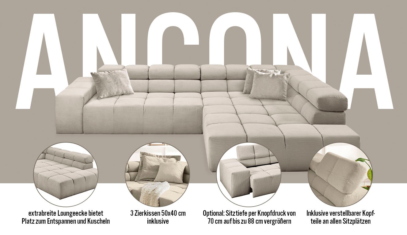 INOSIGN Ecksofa "Ancona, incl. Kopfteilverstellung + 3 Zierkissen, L-Form, Breite 249cm" wahlw. motorische Sitztiefenver...