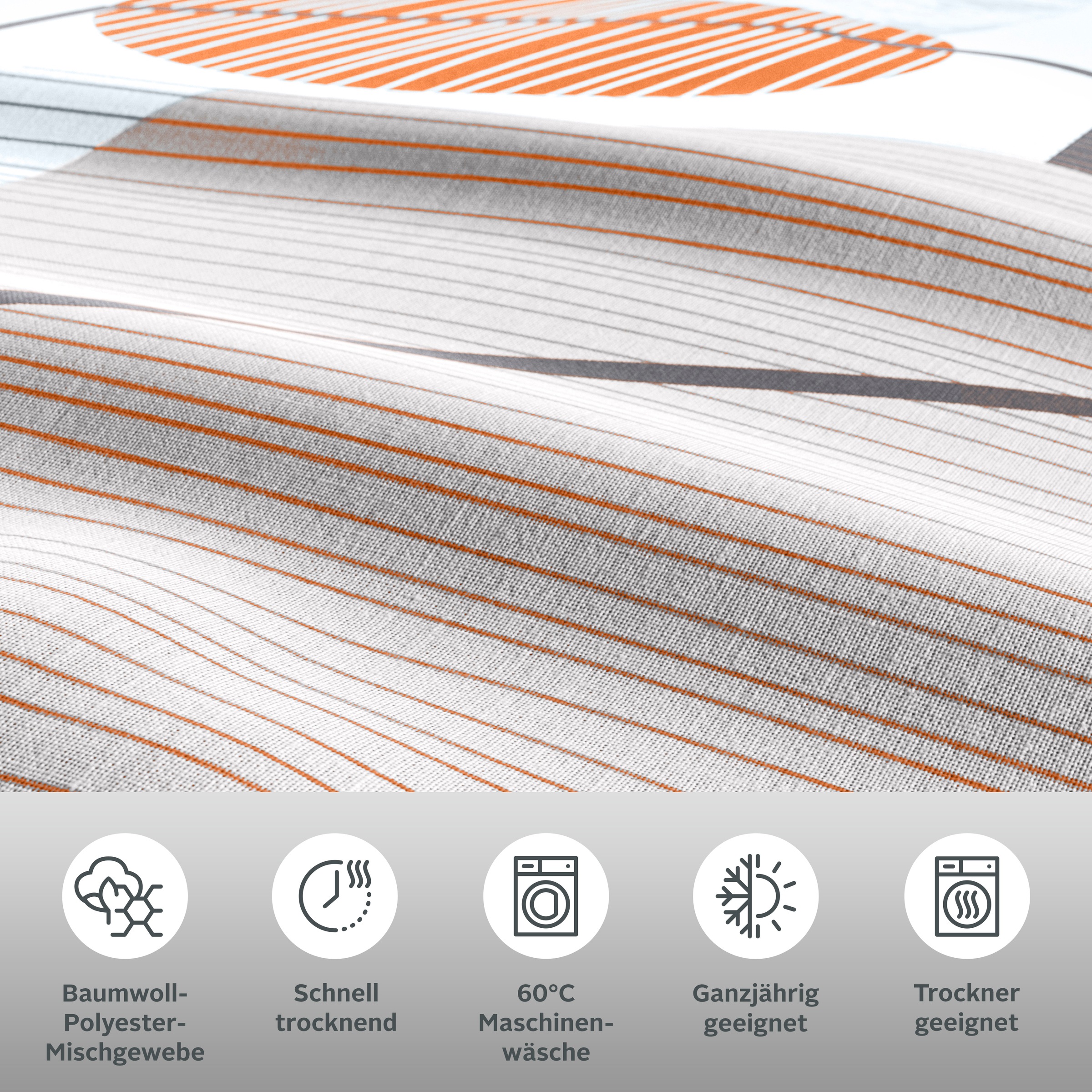 Die wunderschöne Bettwäsche Emmi der Marke my home besticht durch das schön abgestimmte Design aus eine Kombination von Kreisen, Sechseck und Streifen. Die weichen Stoffqualitäten haben eine schöne glatte Oberfläche und unterstützen die Initiative Cotton made in Afrika. Kissen- und Bettbezug sind mit Knöpfen ausgestattet, bis 60°C maschinenwaschbar., Allgemein: Anzahl Teile: 2, Anzahl Bettbezüge: 1 Stk., Anzahl Kissenbezüge: 1 Stk., Maßangaben: Breite Bettbezug: 155 cm, Länge Bettbezug: 220 cm, Breite Kissenbezug: 80 cm, Länge Kissenbezug: 80 cm, Optik/Stil: Farbbezeichnung: orange, Optik Kissenbezug: gemustert, Optik Kissenbezug Wendeseite: gemustert, Optik Bettbezug: gemustert, Verschluss: Verschluss Kissenbezug: Knöpfe, Verschluss Kissenbezug Details: verdeckter Knopfverschluss, Verschluss Bettbezug: Knöpfe, Verschluss Bettbezug Details: verdeckter Knopfverschluss, Material: Materialart: Polycotton recycelt, Materialzusammensetzung: Obermaterial: 60% Baumwolle, 40% Polyester, Flächengewicht: 88 g/m², Pflegehinweis: Pflegehinweise: 60°C Maschinenwäsche, Keine chemische Reinigung, Trocknen mit reduzierter thermischer Belastung (60°C), mäßig heiß bügeln (150°C), nicht bleichen, Wissenswertes: Farbhinweise: Bitte beachten Sie, dass die Farben auf Ihrem Monitor von den Originalfarbtönen abweichen können., OEKO-TEX® Standard 100 Zertifikatsnummer: Sammelzertifikat 09.0.67812, Produktdetails: Markeninformationen: MyHome Inspiriert von aktuellen Wohntrends bietet myhome immer neue Ideen und vielfältige Einrichtungsprodukte mit Wohlfühlgarantie. Und das modern und stilvoll zu Top-Preisen.