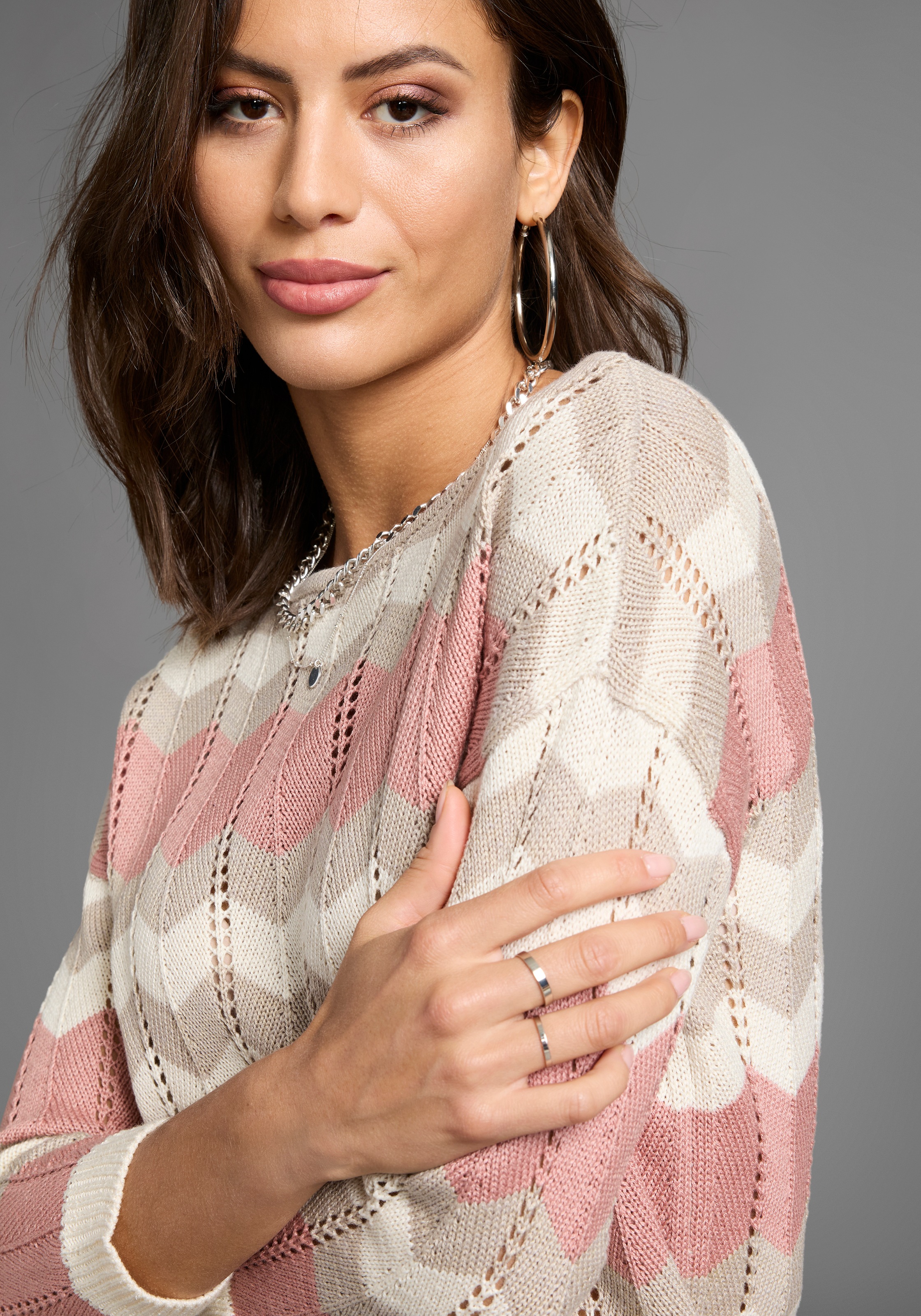 Gut kombinierbarer Damen-Strickpullover von Laura Scott mit Ajour-Strickmuster. Mit einem taillenbedeckenden und figurumspielenden Schnitt. Die Ärmel sind 3/4-lang. Das Oberteil aus Feinstrick fühlt sich weich auf der Haut an und ist bequem zu tragen., Material: Materialzusammensetzung: Obermaterial: 50% Baumwolle, 50% Polyacryl, Materialart: Feinstrick, Materialeigenschaften: elastisch, Pflegehinweise: Maschinenwäsche, Farbe: Farbbezeichnung: beige-weiß-rosa-gestreift, Passform/Schnitt: Ausschnitt: U-Boot-Ausschnitt, Ärmellänge: 3/4 Arm, Passform: figurumspielend, Schnittform Länge: taillenbedeckt, Details: Besondere Merkmale: mit Ajourstrickmuster und 3/4 Ärmeln