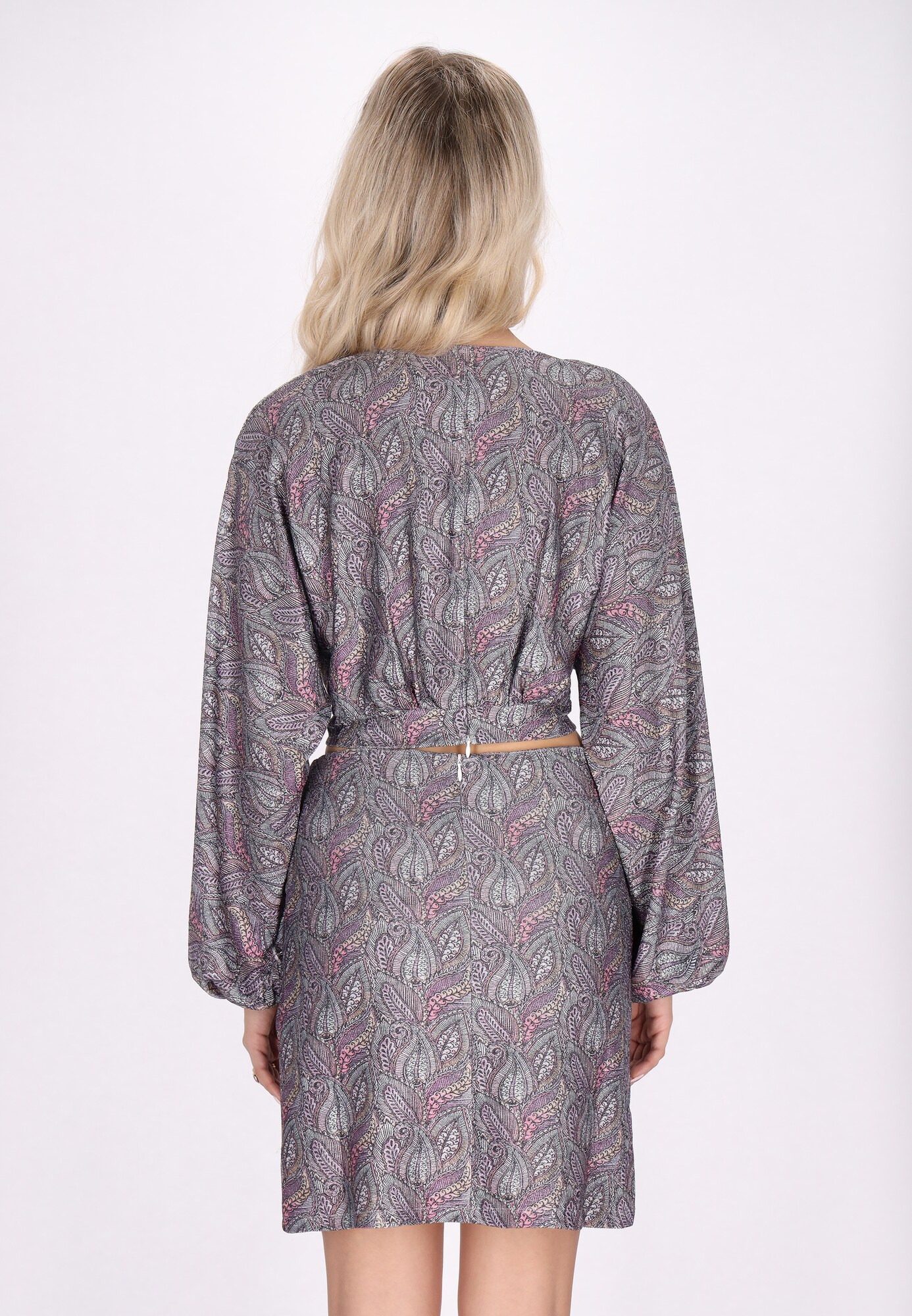 Blusen-Stil: Schlupfbluse; Design: Puffärmel; Material: Jersey; Ausschnitt: V-Ausschnitt; Muster: Paisley-Muster; Hemdkragen: Kragenlos; Details: Drapiert/gerafft; Extras: All-Over-Muster; Passform: Normale Passform; Ärmellänge: Langarm; Länge: Kurzer Schnitt