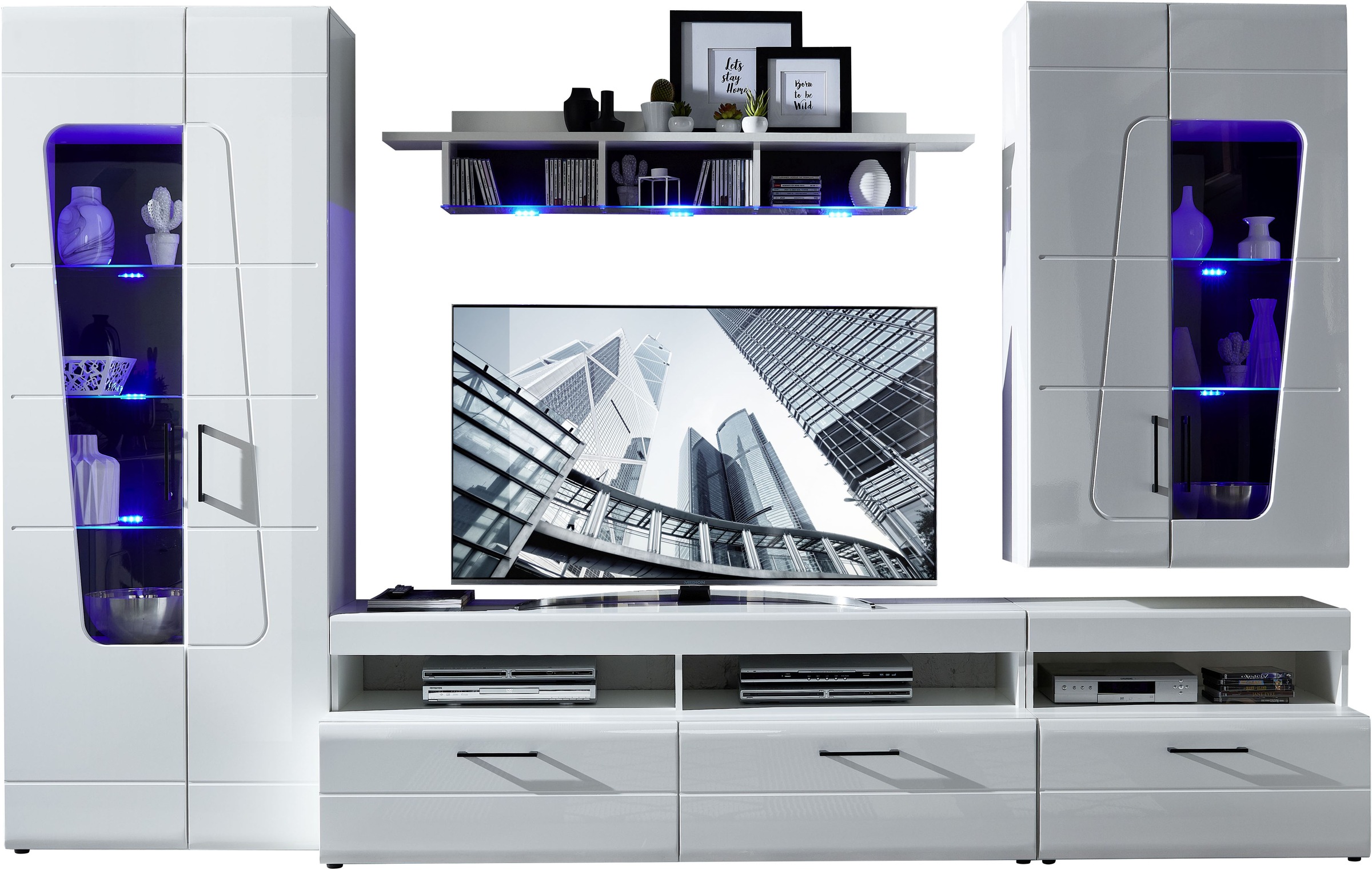 SPIRIT PLUS Wohnwand Komplett-Set in Hochglanz Weiß - Moderne Schrankwand mit blauer LED-Beleuchtung für Ihr Wohnzimmer - 330 x 209 x 47 cm (B/H/T), Produktdetails: Set beinhaltet: Wohnwand bestehend aus: : 1 Hängevitrine, 1 Vitrine, 2 Lowboard, 1 Wandregal, . Details: : Hochglanz-Fronten, FSC®-zertifizierter Holzwerkstoff, Teilmassiv, Mit Glastüren, Pflegeleichte Oberflächen, Viel Stauraum, Moderne Trendfarben, Inklusive Beleuchtung, Schubkästen mit Soft-Close-Funktion, Tür mit Soft-Close-Funktion, Metallgriffe, Ganzmetall-Scharniere, HOCHGLANZ WEISS - Die Front glänzt in Hochglanz weiß, der Korpus ist weiß matt. Das sorgt zusammen mit der blauen LED-Beleuchtung für einen unverwechselbaren und besonderen Look, SPIRIT PLUS Wohnwand Komplett-Set in Hochglanz Weiß Moderne Schrankwand mit blauer LED-Beleuchtung für Ihr Wohnzimmer 330 x 209 x 47 cm (B/H/T), . Hängevitrine: : 1 Glastür, 1 Holzt, Art Griffe: Bügelgriff, Farbe & Material: Material Korpus: Holzwerkstoff, Material Beschläge: Metall, Material Griffe: Metall, Farbbezeichnung: weiß Hoglanz MDF, weiß matt, sichtbare Rückwände schwarz, Material: Glas, Holzwerkstoff, MDF, Oberflächenbeschichtung: PCV-Tiefziehfront, Papierbeschichtung, Optik: hochglanz, Beleuchtung: WEEE-Reg.-Nr. DE: 31.356.640, Maßangaben: Breite: 330 cm, Tiefe: 52 cm, Höhe: 209 cm, Lieferung & Montage: Hinweis Lieferumfang: Vitrine mit Beleuchtung, Hängevitrine mit Beleuchtung, TV-Unterteil (80 x 60), TV-Unterteil (170 x 60), Wandbord mit Boden, Beschläge, Montageanleitung, Wandhalterung, Lieferzustand: zerlegt, Hinweise: Herstellergarantie: 2 Jahre gemäß den Garantie-Bedingungen, Hinweis Maßangaben: Alle Angaben sind ca.-Maße., Wissenswertes: Herstellungsland: Made in Europe