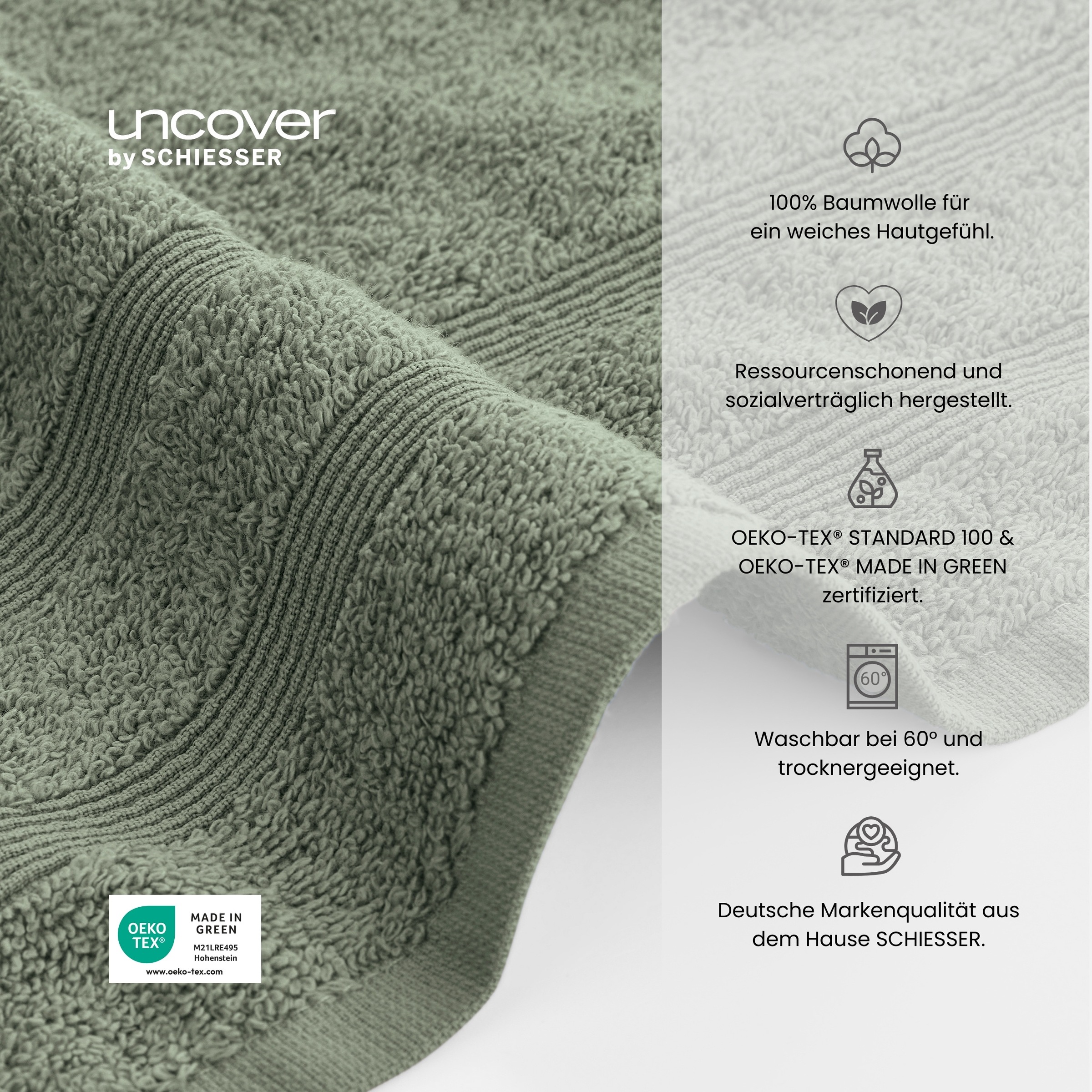 Unsere uncover by Schiesser Handtücher sind ein echter Game-Changer. Auf den ersten Blick sind sie das perfekte Handtuch für dein Badezimmer, aber mit ihrer saugstarken und schnelltrocknenden Oberfläche machen sie auch im Gym oder im Wellnesstempel eine gute Figur., Artikelbezeichnung: Anzahl Teile: 4 Stk., Set-Typ: Set, Farbe: Farbbezeichnung: Grün, Optik/Stil: Optik: unifarben, Bordüre: gewebt, Maßangaben: Breite: 50 cm, Länge: 100 cm, Material: Materialart: Frottier, Materialzusammensetzung: Obermaterial: 100% Baumwolle, Flächengewicht: 450 g/m², Material: Frottier, Hinweise: Pflegehinweise: 60°C Maschinenwäsche, chemische Reinigung nicht erlaubt, mäßig heiß bügeln (150°C), nicht bleichen, trocknergeeignet, Farbhinweise: Bitte beachten Sie, dass die Farben auf Ihrem Monitor von den Originalfarbtönen abweichen können., Produktdetails: Art Handtuch: Handtuch, Aufhängung: Kordel