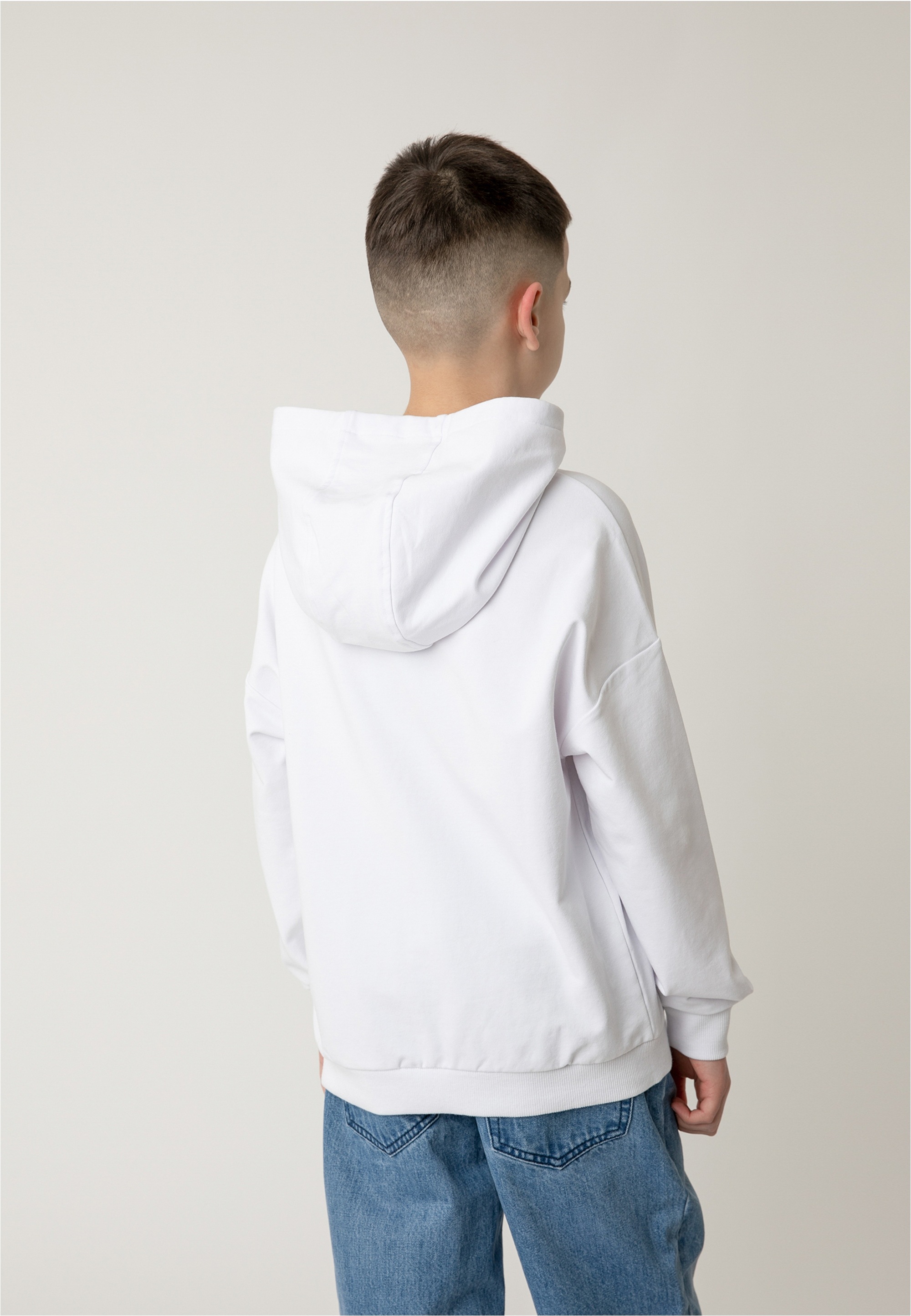 Ein weißes Kapuzensweatshirt unterstreicht den modischen Rapper-Stil eines Jungen im Teenageralter. Die aktuelle übergroße Silhouette, stilvolle Fotodruck, Schriftelemente sowie ein Kontrast Patch machen das Modell außergewöhnlich und reflektiert die helle Persönlichkeit des Jungen., Material: Materialzusammensetzung: 95% Baumwolle, 5% Elasthan, Materialeigenschaften: atmungsaktiv, nicht elastisch, pflegeleicht, Pflegehinweise: Maschinenwäsche, Optik/Stil: Optik: bedruckt, mehrfarbig, Farbe: Farbbezeichnung: weiß-mehrfarbig, Details: Verschluss: Kordel, Besondere Merkmale: mit stylischem Frontprint, Passform/Schnitt: Ausschnitt: ohne Ausschnitt, Ärmellänge: Langarm, Schnittform Länge: normal