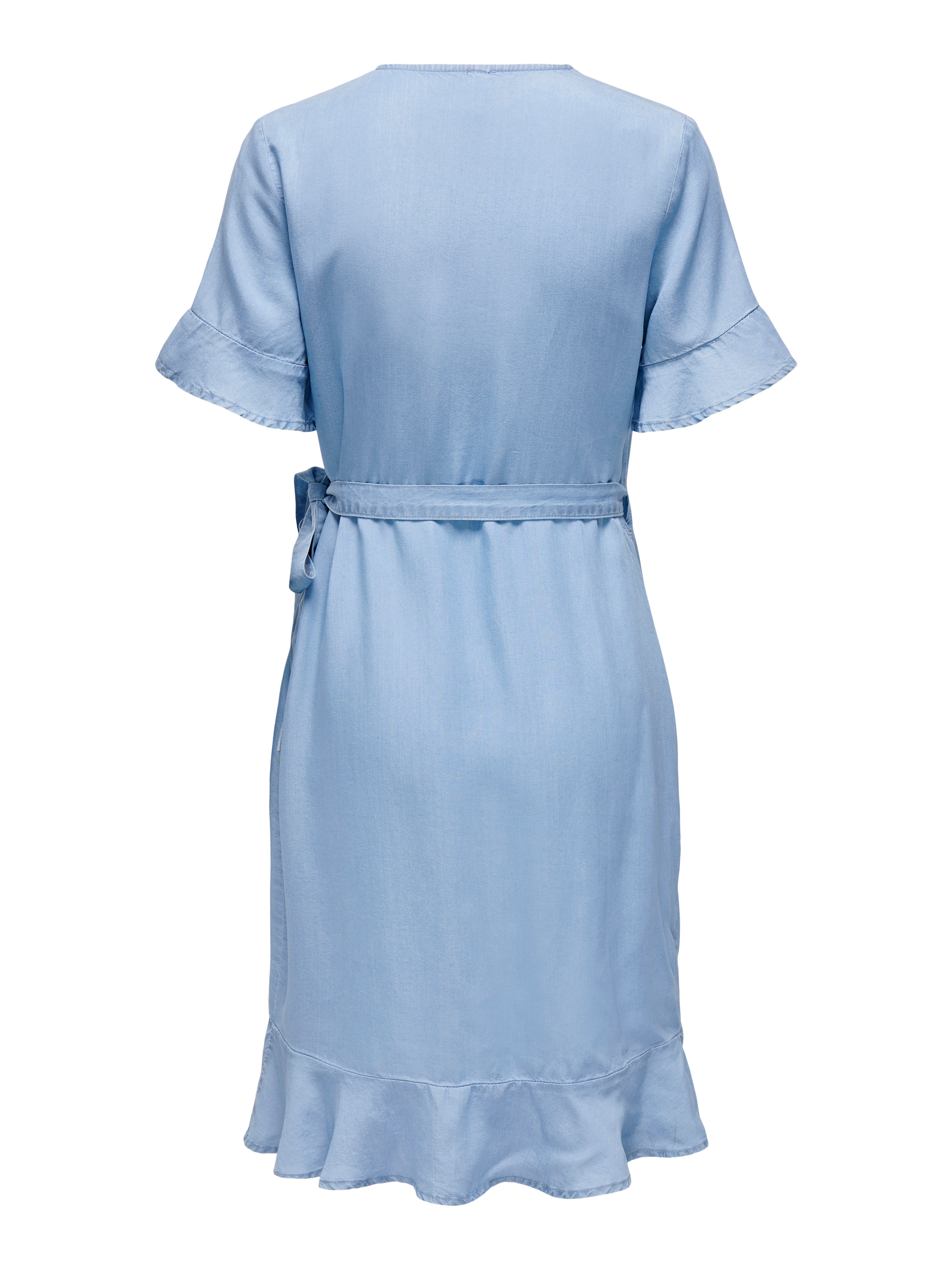 Werte deine Garderobe mit einem stylishen Kleid auf und kreiere einen umwerfenden Look, der zu jedem Anlass und jeder Jahreszeit passt. - Produkttyp : Jeanskleid - Hals : Rundhals - Ärmel : Kurzarm - Ärmel : Glockenärmel - Verschluss : Wickeln - Details : Rüschen - Passform : Locker geschnitten