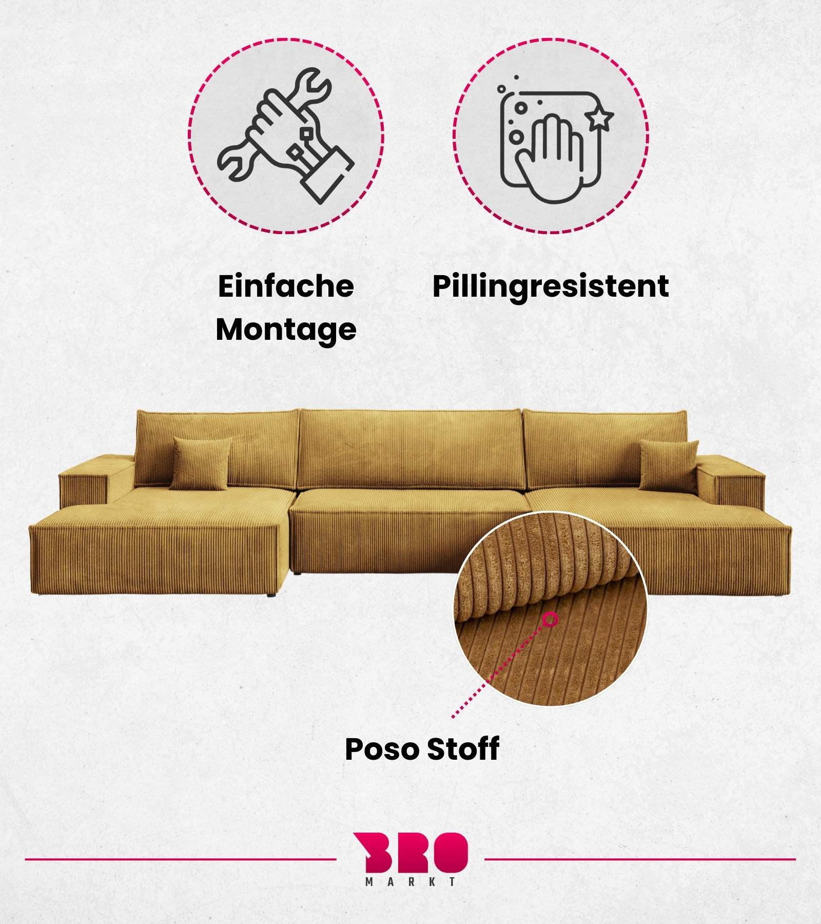 Das Ecksofa Pablo Maxi ist ein funktionales U-förmiges Möbelstück, das viel Sitzfläche bietet, perfekt für Familien oder Gäste. Ausgestattet mit einer Schlaffunktion können Sie ihn schnell und bequem in einen bequemen Schlafplatz verwandeln. Darüber hinaus verfügt das Ecksofa über einen Bettkasten, der die Aufbewahrung erleichtert. Er ist mit Poso-Cordstoff gepolstert, was ihm ein elegantes und gemütliches Aussehen verleiht. Das Set enthält einen Satz Kissen, die den Nutzungskomfort erhöhen. Details: Die Konstruktion des Ecksofas besteht aus Möbelplatte, HDF-Platte und Kiefernholz. Der Sitz besteht aus Wellenfedern und PUR-Schaum. Die Füße bestehen aus Kunststoff. Ein Set aus drei großen Rückenlehnenkissen sorgt für eine bequeme Rückenlehne und erhöht den Nutzungskomfort, lässt sich aber auch wunderbar mit dem Rest der Möbel kombinieren. Die Schlaffunktion mit einer Fläche von 344x140 cm ermöglicht ein gemütliches Nickerchen Mit der DL-Ausklappmechanismus lässt sich das Ecksofa einfach und schnell aufklappen und bietet so einen geräumigen und komfortablen Ruheplatz. Das Ecksofa verfügt über einen tiefen Bettkasten, in dem Sie Kissen, Decken und verschiedene Accessoires aufbewahren können. Rechts- oder Linksausrichtung erhältlich. Das Ecksofa ist nicht beidseitig montierbar. Die andere Seite ist in anderen Angeboten erhältlich Abmessungen: Breite: 398 cm Höhe: 85 cm Tiefe: 148 cm Sitzbreite: 102 cm Sitzhöhe: 38 cm Schlaffläche: 344x133 cm