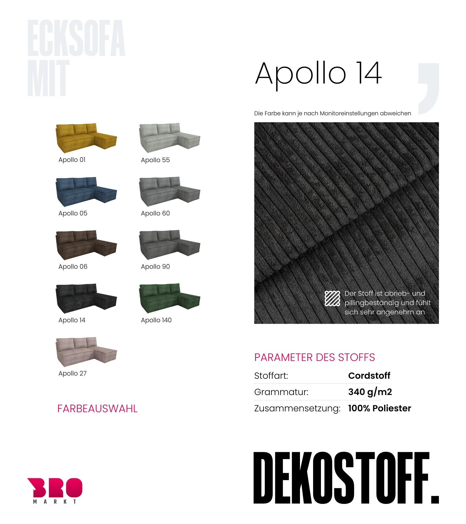 Das Ecksofa Hector ist die ideale Wahl für alle, die modernen Stil und Funktionalität in einem Möbelstück schätzen. Mit einer Schlaffunktion und einer Liegefläche von 138x200 cm sowie einem DL-Automatikmechanismus bietet es eine komfortable Schlafmöglichkeit und wird zum zentralen Element jedes stilvollen Wohnzimmers. Seine minimalistische Form in Kombination mit der eleganten Polsterung verleiht dem Raum eine moderne Note.Bettkasten – Praktikabilität und OrganisationUnter der Sitzfläche des Sofas befindet sich ein geräumiger Bettkasten, der eine einfache Aufbewahrung von Decken, Kissen und anderen Accessoires ermöglicht. Diese Lösung erleichtert den täglichen Gebrauch und trägt zur Ordnung bei, ohne dass zusätzliche Möbel zur Aufbewahrung notwendig sind. So wird das Ecksofa zu einem funktionalen Möbelstück in jedem Wohnzimmer und sorgt gleichzeitig für Komfort und Ästhetik.Komfortable Rückenkissen für optimale EntspannungDas Sofa ist mit drei großen Rückenkissen ausgestattet, die eine bequeme Stütze für den Rücken bieten. Dadurch wird jeder Moment auf dem Sofa noch komfortabler – ob beim Lesen, beim Filmabend oder einfach zur Entspannung nach einem langen Tag. Die ergonomische Anordnung der Kissen macht das Verweilen auf dem Sofa zu einem puren Vergnügen.Cordstoff – Eleganz und LanglebigkeitDie Polsterung des Sofas besteht aus hochwertigem Cordstoff, der sich durch seine gerippte Struktur und Weichheit auszeichnet. Der Cordstoff verleiht dem Möbelstück einen unverwechselbaren Stil und bietet gleichzeitig Haltbarkeit und Widerstandsfähigkeit gegen den täglichen Gebrauch. So sieht das Sofa nicht nur hervorragend aus, sondern bietet auch langanhaltenden Komfort und bleibt über Jahre hinweg attraktiv und stilvoll.Bonell-Federn – ideal für häufiges Schlafen und dauerhafte FormbeständigkeitDie
