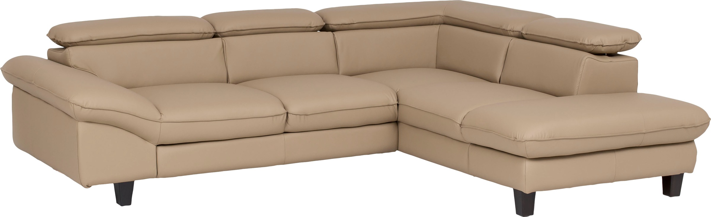 Hohen Komfort bietet das Ecksofa »Pilot« mit Kopfteilverstellung von Home affaire. Die Eckcouch zeigt sich im modernen Look und begeistert mit einer schönen Formsprache. Dank der geschmackvollen Farbgestaltung kann das Sofa problemlos in die bestehende Einrichtung integriert werden. Stabilität erhält die hochwertig verarbeitete Polsterecke durch ein Untergestell, das aus FSC®-zertifiziertem Holzwerkstoff besteht. Für den Komfort sorgt neben einer Wellenunterfederung eine straffe und atmungsaktive Polsterung. Das Sofa passt sich zudem den räumlichen Gegebenheiten bestens an, da die Ottomane sowohl links als auch rechts bestellbar ist. Auf Wunsch ist die Couch mit Bettfunktion sowie Bettkasten erhältlich., Produktdetails: Markeninformationen: Seit 2001 begeistert uns Home affaire mit Landhausmöbeln zum Verlieben. Ob modern, romantisch oder natürlich traditionell – der Fantasie für wunderschönes Einrichten sind kaum Grenzen gesetzt., Ausstattung & Funktionen: Stellvariante: Ottomane rechts, Polsteraufbau: Wellenunterfederung, Raumgewicht: 25 kg/m³, Anzahl Sitzflächen: 5,5 Stk., Maßangaben: Breite: 266 cm, Tiefe: 108 cm, Höhe: 73 cm, Sitzhöhe: 46 cm, Breite Sitzfläche: 188 cm, Tiefe Sitzfläche: 65 cm, Vordere Breite Ottomane: 108 cm, Tiefe Ottomane: 214 cm, Breite Armlehnen: 41 cm, Tiefe Armlehnen: 104 cm, Höhe Armlehnen: 57 cm, Länge Liegefläche: 180 cm, Höhe Rückenverstellung maximal: 96 cm, Höhe Kopfteilverstellung maximal: 96 cm, Breite Bettkasten: 88 cm, Höhe Bettkasten: 14 cm, Höhe Füße: 12 cm, Bodenfreiheit: 12 cm, Höhe Rückenlehne: 73 cm, Höhe maximal: 96 cm, Höhe minimal: 73 cm, Hinweis Maßangaben: Alle Angaben sind ca.-Maße., Material: Bezug: Leder PAMPAS, Material Untergestell: Holzwerkstoff, Material Füße: Holz, Information Materialzusammensetzung: 100 % Polyester, Feinstruktur 75000 Scheurtouren, Struktur 35000 Scheuertouren, Mikrofaser 40000 Scheuertouren, Farbe: Farbbezeichnung: cappuccino, Farbhinweise: Bitte beachten Sie, dass bei Online-Bildern der Artikel die Farben auf dem heimischen Monitor von den Originalfarbtönen abweichen können., Allgemein: Ausführung: mit Kopfteilverstellung, ohne Bettfunktion, ohne Bettkasten, Lieferung & Montage: Lieferzustand: montiert