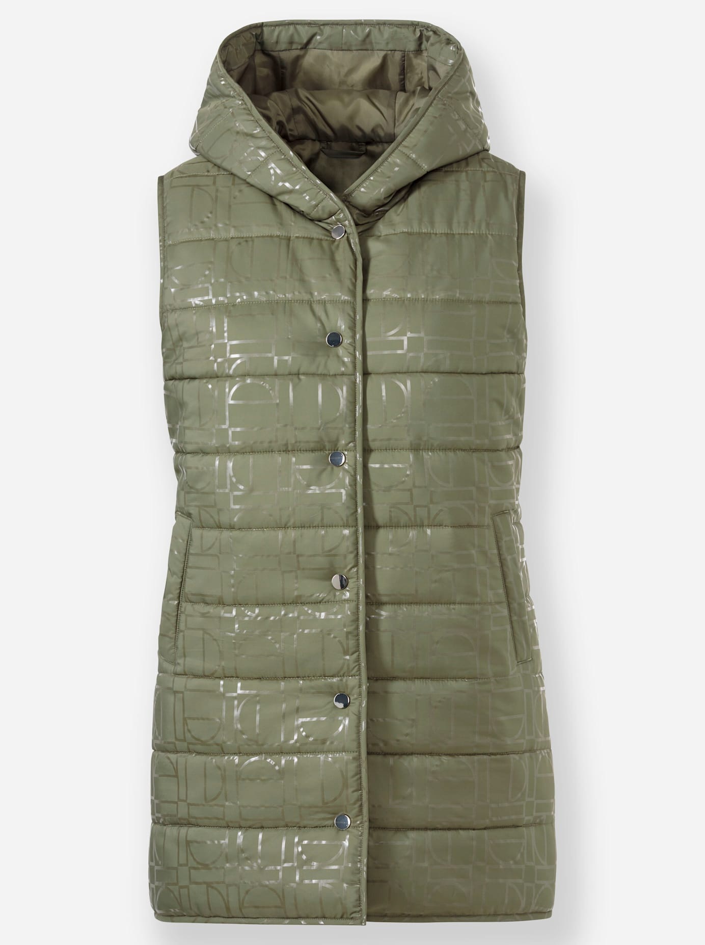 Steppweste Kombistarkes Trendhighlight mit Glanzdruck allover. Mit Kapuze und Druckknopfleiste. Seitliche Taschen. 1 Innentasche. Leicht wattiert. Aus recyceltem Polyester. 100% Polyester. Futter: 100% Polyester. Maschinenwäsche., Material: Materialzusammensetzung: 100% Polyester, Pflegehinweise: Maschinenwäsche, Optik/Stil: Optik: bedruckt, gemustert, unifarben, Farbe: Farbbezeichnung: khaki, Passform/Schnitt: Kragen: ohne Kragen, Details: Kapuze: mit Kapuze, Taschen: Eingrifftasche, Eingrifftaschen, Verschluss: Druckknopf