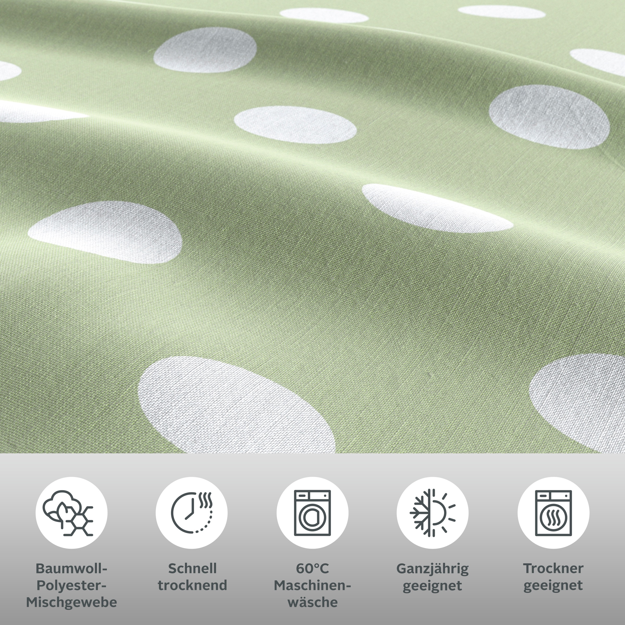 Diese schöne Wendebettwäsche "DOTS" der Marke my Home verzaubert jedes Schlafzimmer. Das Design der Vorder- und Rückseite unterscheidet sich durch die gekonterte Farbgebung. Die hübschen Punkte machen die Bettwäsche zu etwas Besonderem. Bettbezug sowie Kissenbezug sind mit Knöpfen ausgestattet. Der Stoff wird aus 50% Baumwolle und 50% recyceltem Polyester hergestellt. Praktisch: "DOTS" kann bei 60 Grad in der Maschine gewaschen werden., Allgemein: Anzahl Teile: 2 Stk., Anzahl Bettbezüge: 1 Stk., Anzahl Kissenbezüge: 1 Stk., Maßangaben: Breite Bettbezug: 155 cm, Länge Bettbezug: 220 cm, Breite Kissenbezug: 80 cm, Länge Kissenbezug: 80 cm, Optik/Stil: Farbbezeichnung: grün, Optik Kissenbezug: gepunktet, Optik Kissenbezug Wendeseite: gepunktet, Optik Bettbezug: gepunktet, Optik Bettbezug Wendeseite: gepunktet, Wendefunktion: Wendebettbezug, Wendekissenbezug, Verschluss: Verschluss Kissenbezug: Knöpfe, Verschluss Kissenbezug Details: verdeckte Knopfleiste, Verschluss Bettbezug: Knöpfe, Verschluss Bettbezug Details: verdeckte Knopfleiste, Material: Materialart: Polycotton recycelt, Materialzusammensetzung: Obermaterial: 50% Baumwolle, 50% Polyester, Flächengewicht: 92 g/m², Pflegehinweis: Pflegehinweise: 60°C Maschinenwäsche, Keine chemische Reinigung, Trocknen mit reduzierter thermischer Belastung (60°C), mäßig heiß bügeln (150°C), nicht bleichen, Wissenswertes: Farbhinweise: Bitte beachten Sie, dass die Farben auf Ihrem Monitor von den Originalfarbtönen abweichen können., OEKO-TEX® Standard 100 Zertifikatsnummer: Sammelzertifikat 09.0.67812