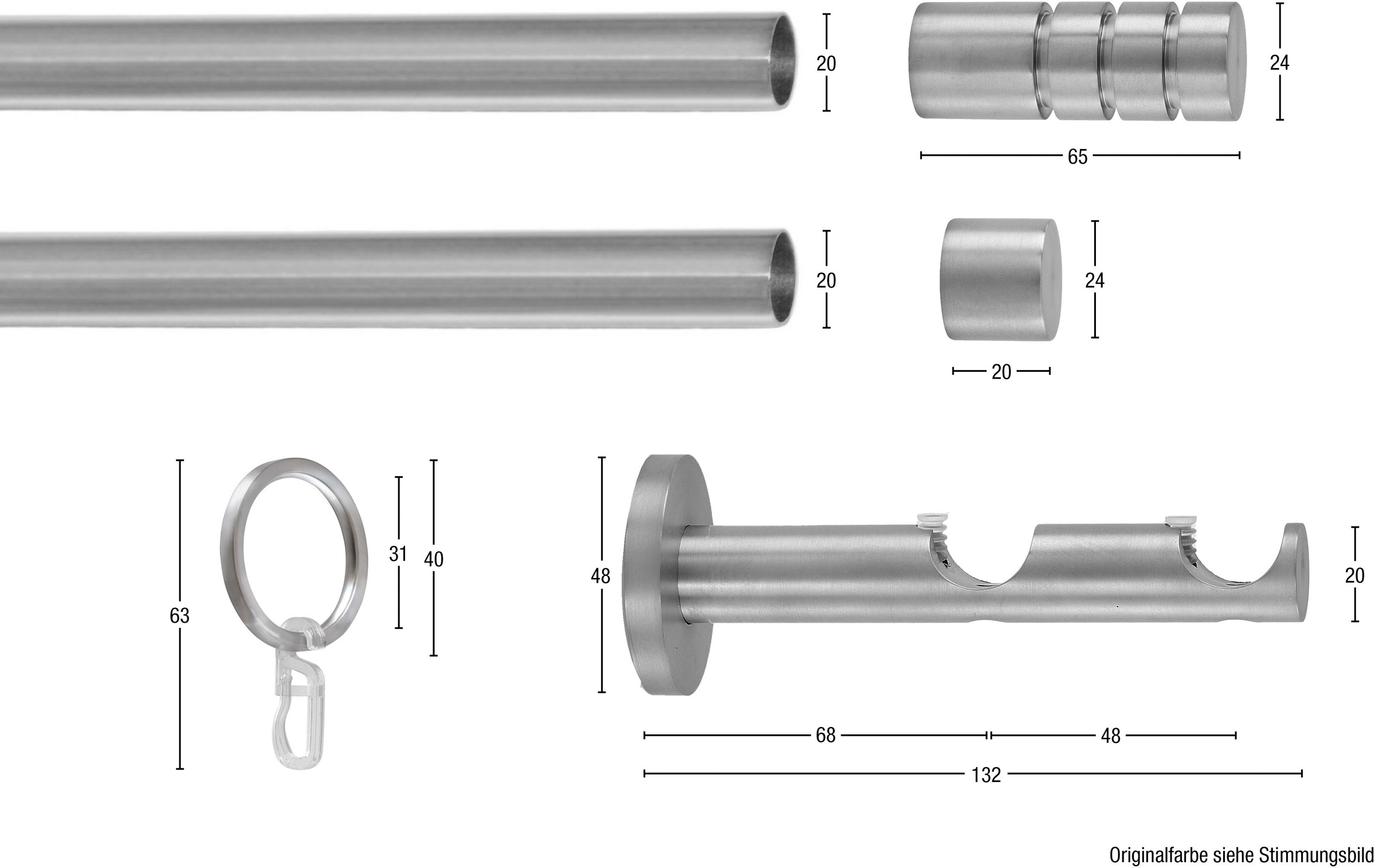 Rundstangengarnitur EASY von GARESA mit einem Durchmesser von 20 mm inkl. Ringe mit Haken, in 1- und 2-läufiger Ausführung alu vernickelt, alu silber und alu verchromt. Verschiedene Endknöpfe stehen zur Auswahl. Im Lieferumfang enthalten: 1 Rundrohrstange (bei 2-läufiger Ausführung 2 Stangen; Material bei der Farbe vernickelt und silber Aluminium, verchromt ist Eisen Folie), Wandträger, Endknöpfe/Endkappe und Ringe aus Aluminium, Faltenlegehaken aus Kunststoff. Werden mehr Ringe mit Haken als im Lieferumfang enthalten benötigt, können diese bitte unter folgender Artikelnummer bestellt werden: Farbe vernickelt 63034651, Farbe silber 30340558, Farbe verchromt 90247026. Wenn 2 Stangen miteinander verbunden werden sollten, um ein längeres Maß zu erzielen, können Stangenverbinder unter der Artikelnummer 16823714 bestellt werden (für 2-läufige Ausführung doppelte Anzahl bestellen)., Details: Art Montage: verschraubt, Farbbezeichnung: aluminiumfarben/nickelfarben, Anzahl Läufe: 2 läufig, Ort Montage: Wandmontage, Material Endstück: Aluminium, Material: Aluminium, Maße & Gewicht: Länge: 160 cm, Durchmesser: 20 mm, Konfektion: Wunschmaßlänge, Lieferumfang: Lieferumfang: Gardinenstange, Träger, Endstücke, Befestigungsmaterial, Montageanleitung, Verbindungsstück, Ringe, Ringhaken, Anzahl Teile: 1 Stk., Wissenswertes: Messhinweise: Mit folgender Formel errechnet man die Gardinenstangenlänge: Gardinenstangenlänge = Fensterbreite + ca. 20 cm Überstand links + ca. 20 cm Überstand rechts. Bestellmaß = Stangenmaß!, Trägerhinweise: Ab einer Länge von 200 cm wird ein 3. Träger, ab 420 cm ein 4. Träger mitgeliefert., Verbindungsstückhinweise: Ab einer Länge von 230 cm wird mittig geteilt geliefert, ab 450 cm wird 2 x geteilt geliefert, Maßartikel: Dieses Produkt wird speziell für Sie maßgenau angefertigt. Bitte beachten Sie, dass eine Rückgabe daher ausgeschlossen ist (außer bei begründeten Qualitätsmängeln).