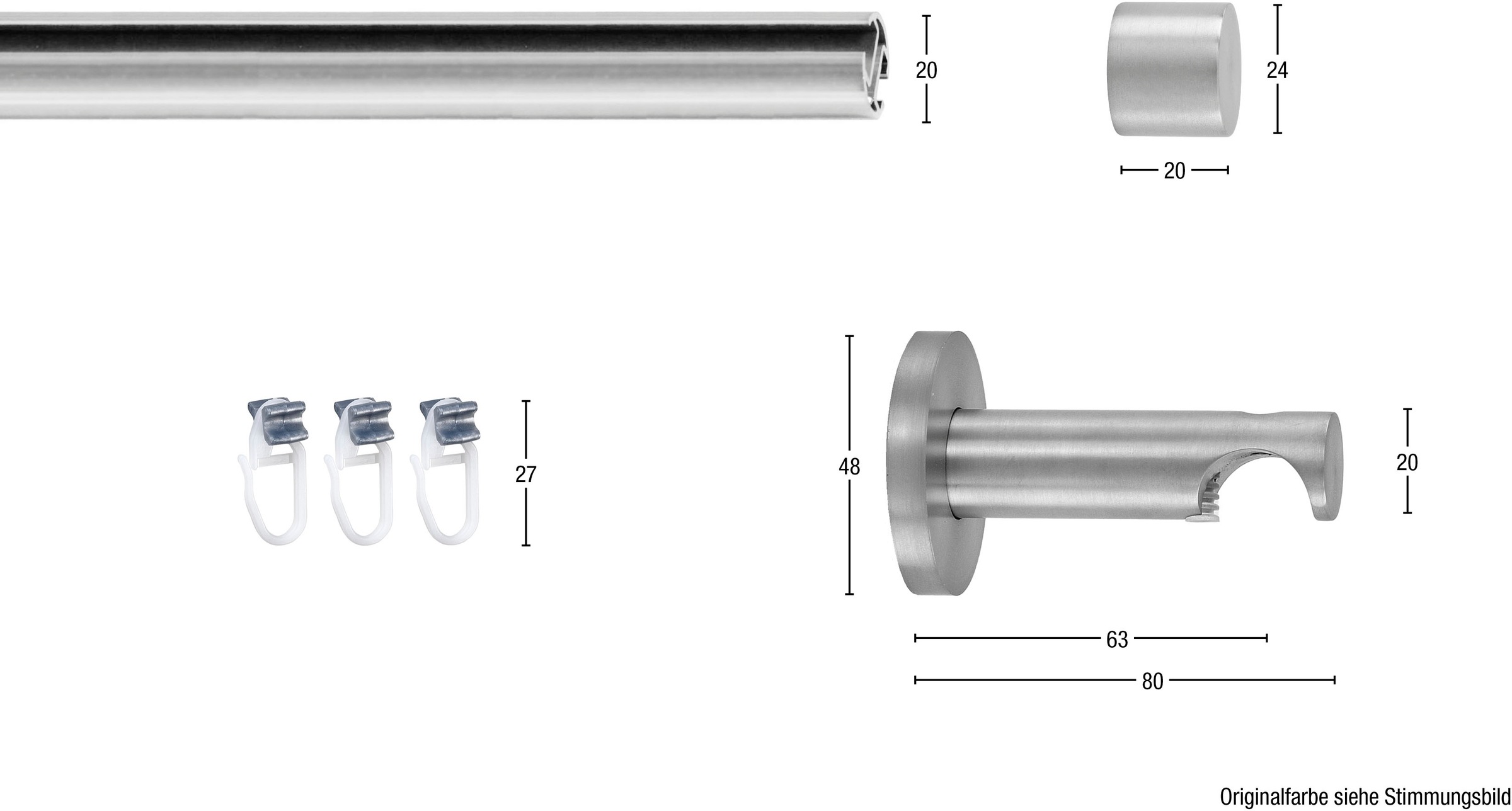 Innenlaufgarnitur EASY von GARESA mit einem Durchmesser von 20 mm inkl. Gleiter, in 1- und 2-läufiger Ausführung in den Farben alu vernickelt, alu silber und alu verchromt. Verschiedene Endknöpfe stehen zur Auswahl. Sehr stabile Ausführung und daher auch für mittelschwere Vorhänge geeignet. Im Lieferumfang enthalten: 1 Aluminium-Innenlaufrohr (bei 2-läufig 2 Rohre), Wandträger sowie Endknöpfe/Endkappen aus Alu, Gleiter aus Kunststoff. Werden mehr Gleiter als im Lieferumfang enthalten benötigt, können die passenden Gleiter unter der Artikelnummer 17502863 nachbestellt/dazubestellt werden. Wenn 2 Stangen miteinander verbunden werden sollten, um ein längeres Maß zu erzielen, kann der Stangenverbinder 12705063 dazubestellt werden. (ACHTUNG: für 2-läufige Ausführung bitte doppelte Anzahl bestellen)., Details: Art Montage: verschraubt, Farbbezeichnung: silberfarben, Anzahl Läufe: 1 läufig, Ort Montage: Wandmontage, Material Endstück: Aluminium, Material: Aluminium, Material Innenlauf: Aluminium, Maße & Gewicht: Länge: 570 cm, Breite: 60 cm, Durchmesser: 20 mm, Konfektion: Wunschmaßlänge, Innenlaufmaß: 6 mm, Lieferumfang: Lieferumfang: Gardinenstange, Träger, Endstücke, Befestigungsmaterial, Schrauben, Dübel, Gleiter, Montageanleitung, Verbindungsstück, Anzahl Teile: 1 Stk., Wissenswertes: Messhinweise: Mit folgender Formel errechnet man die Gardinenstangenlänge: Gardinenstangenlänge = Fensterbreite + ca. 20 cm Überstand links + ca. 20 cm Überstand rechts. Bestellmaß = Stangenmaß!, Trägerhinweise: Ab einer Länge von 200 cm werden 3 Träger mitgeliefert, ab 420 cm 4 Stück., Verbindungsstückhinweise: Ab einer Länge von 230 cm wird mittig geteilt geliefert, ab 450 cm wird 2 x geteilt geliefert., Maßartikel: Dieses Produkt wird speziell für Sie maßgenau angefertigt. Bitte beachten Sie, dass eine Rückgabe daher ausgeschlossen ist (außer bei begründeten Qualitätsmängeln).