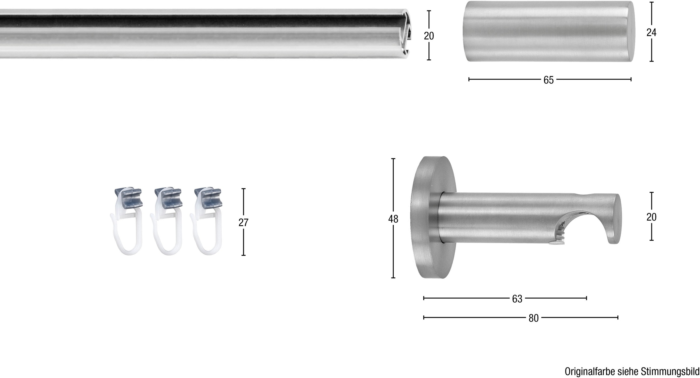 Innenlaufgarnitur EASY von GARESA mit einem Durchmesser von 20 mm inkl. Gleiter, in 1- und 2-läufiger Ausführung in den Farben alu vernickelt, alu silber und alu verchromt. Verschiedene Endknöpfe stehen zur Auswahl. Sehr stabile Ausführung und daher auch für mittelschwere Vorhänge geeignet. Im Lieferumfang enthalten: 1 Aluminium-Innenlaufrohr (bei 2-läufig 2 Rohre), Wandträger sowie Endknöpfe/Endkappen aus Alu, Gleiter aus Kunststoff. Werden mehr Gleiter als im Lieferumfang enthalten benötigt, können die passenden Gleiter unter der Artikelnummer 17502863 nachbestellt/dazubestellt werden. Wenn 2 Stangen miteinander verbunden werden sollten, um ein längeres Maß zu erzielen, kann der Stangenverbinder 12705063 dazubestellt werden. (ACHTUNG: für 2-läufige Ausführung bitte doppelte Anzahl bestellen)., Details: Art Montage: verschraubt, Farbbezeichnung: silberfarben, Anzahl Läufe: 1 läufig, Ort Montage: Wandmontage, Material Endstück: Aluminium, Material: Aluminium, Material Innenlauf: Aluminium, Maße & Gewicht: Länge: 510 cm, Breite: 53 cm, Durchmesser: 20 mm, Konfektion: Wunschmaßlänge, Innenlaufmaß: 6 mm, Lieferumfang: Lieferumfang: Gardinenstange, Träger, Endstücke, Befestigungsmaterial, Schrauben, Dübel, Gleiter, Montageanleitung, Verbindungsstück, Anzahl Teile: 1 Stk., Wissenswertes: Messhinweise: Mit folgender Formel errechnet man die Gardinenstangenlänge: Gardinenstangenlänge = Fensterbreite + ca. 20 cm Überstand links + ca. 20 cm Überstand rechts. Bestellmaß = Stangenmaß!, Trägerhinweise: Ab einer Länge von 200 cm werden 3 Träger mitgeliefert, ab 420 cm 4 Stück., Verbindungsstückhinweise: Ab einer Länge von 230 cm wird mittig geteilt geliefert, ab 450 cm wird 2 x geteilt geliefert., Maßartikel: Dieses Produkt wird speziell für Sie maßgenau angefertigt. Bitte beachten Sie, dass eine Rückgabe daher ausgeschlossen ist (außer bei begründeten Qualitätsmängeln).