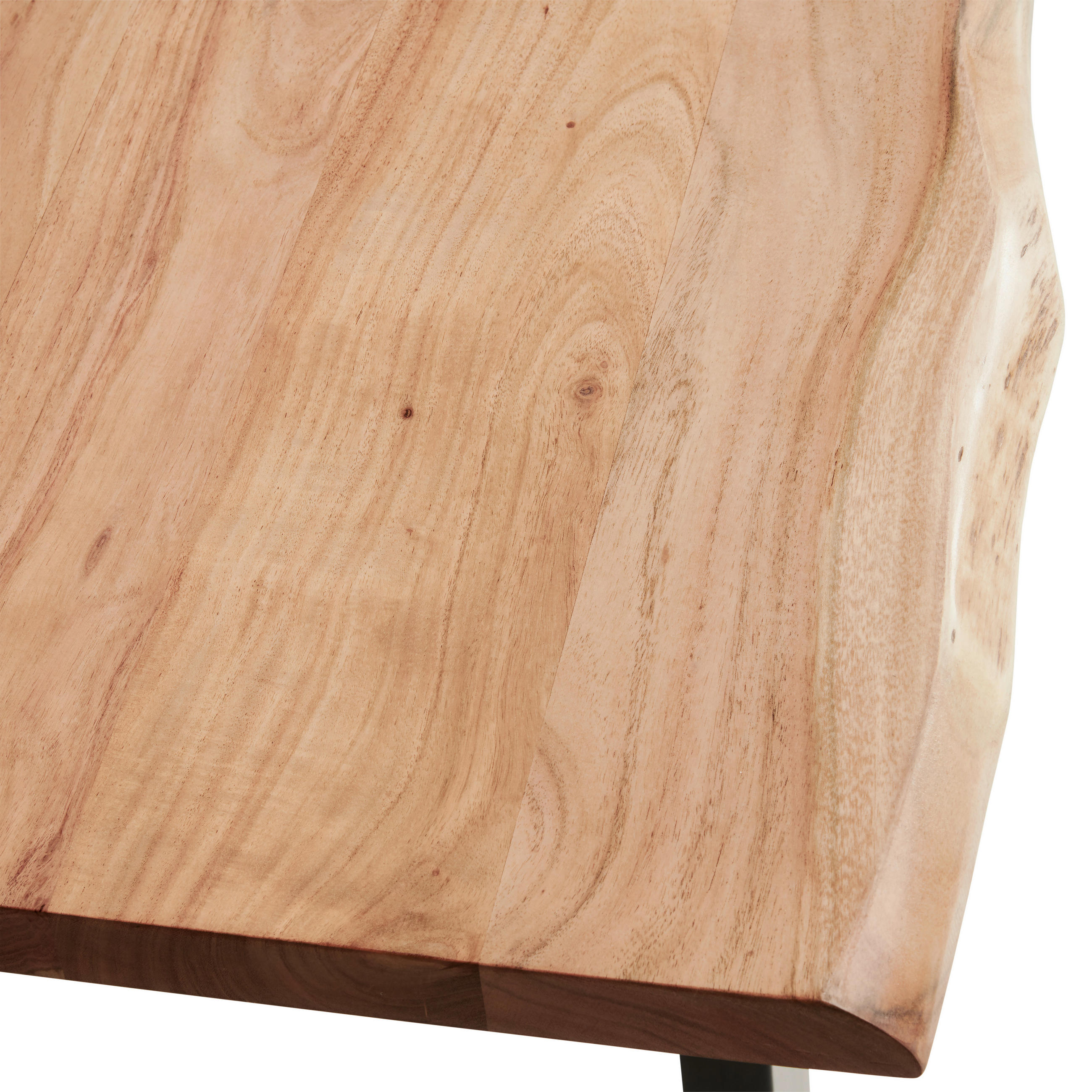 Dieser rechteckige Livetastic Esstisch (B x T: ca. 140 x 80 cm) mit Baumkante an den Längsseiten bringt Ihre Vorliebe für Interior-Ideen zum Ausdruck, die mit der Zeit gehen und formbetonte Rustikalität ausstrahlen. Seine ca. 35 mm starke Platte besteht aus lackiertem Akazienholz, dessen Maserung ein natürliches Flair verströmt. Das Gestell mit 2 U-Beinen kombiniert das charakterstarke Hartholz mit pulverbeschichtetem Eisen in Schwarz, um eine stabile Basis zu gewährleisten und gleichzeitig einen markanten Kontrast-Look zu kreieren. Stellen Sie mit diesem ca. 76 cm hohen Esstisch (ca. 160 x 80 cm) mit Baumkante, der maximal bis ca. 110 kg belastbar ist, ein Möbel up to date in den Mittelpunkt Ihrer Einrichtung!